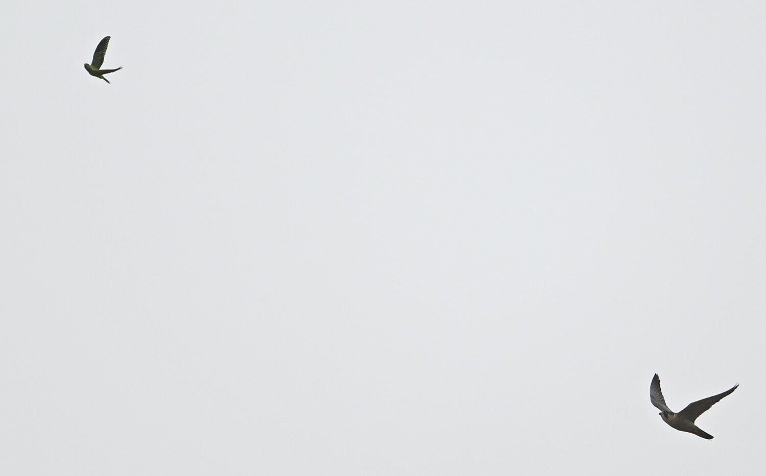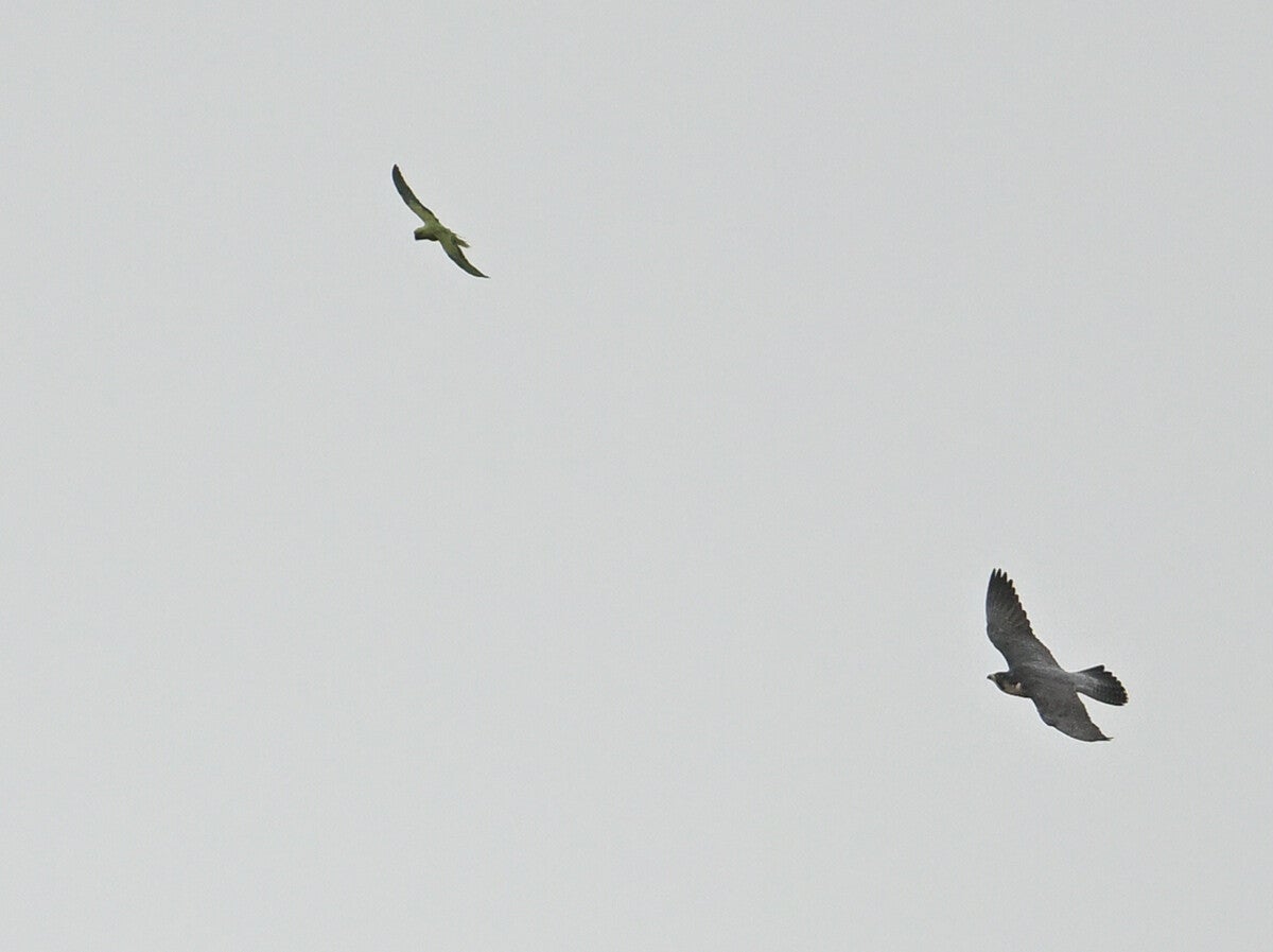 Plotseling stuift ze af, ze heeft een passerende Halsbandparkiet op het oog.