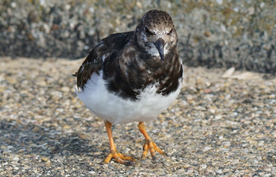 Deze Paarse Strandloper heeft helaas slechts één bruikbare poot, maar weet zich toch verrassend goed te redden :