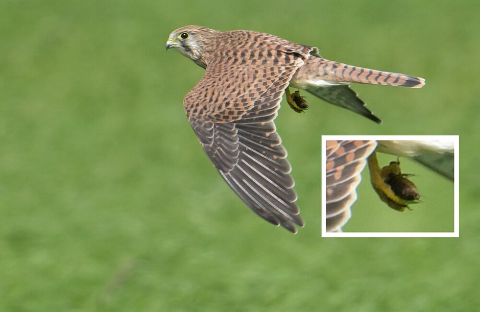 Gelukkig verschijnen er totaal 3 Torenvalken die op Veenmollen jagen :