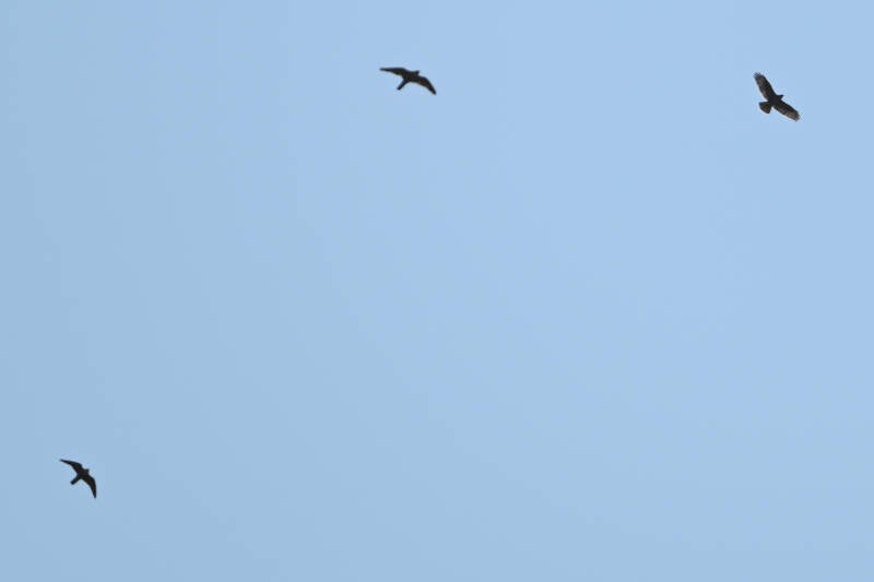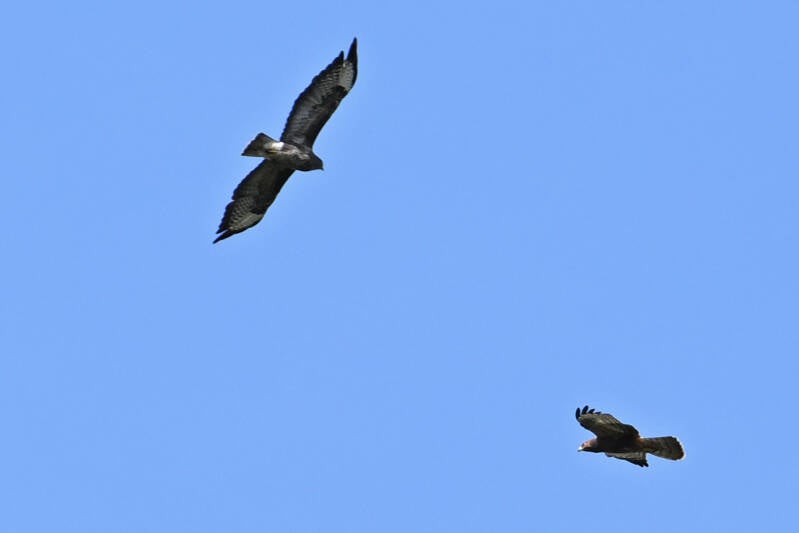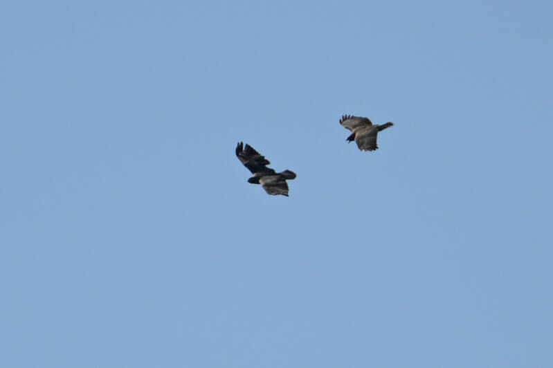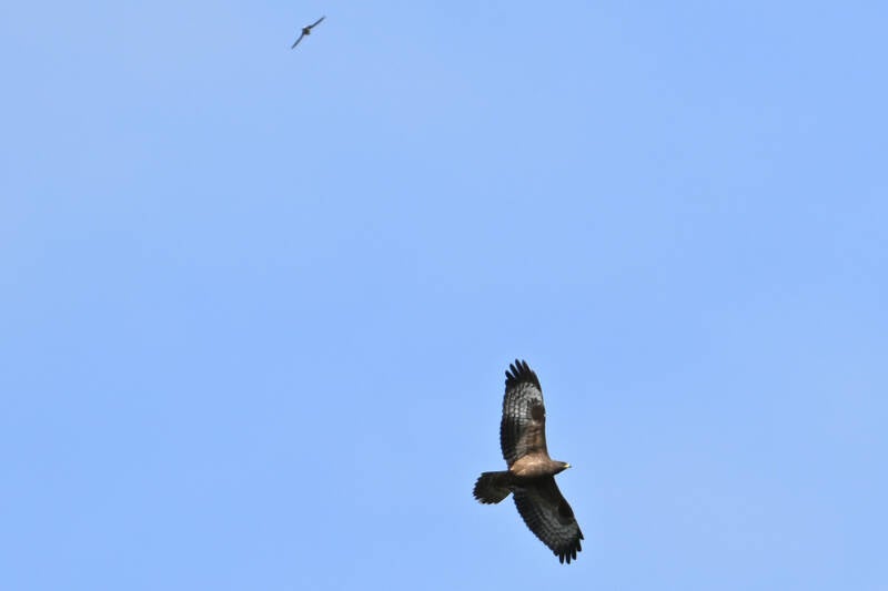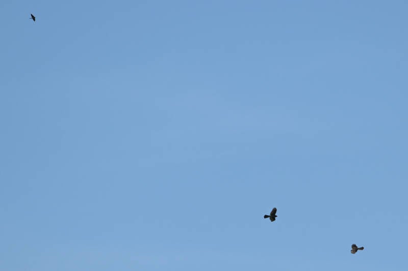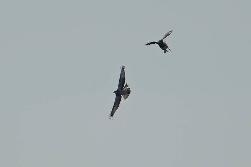 Er zitten meerdere roofvogels in de lucht....Eerst krijgt hij te maken met een Buizerd..(Rechts)
