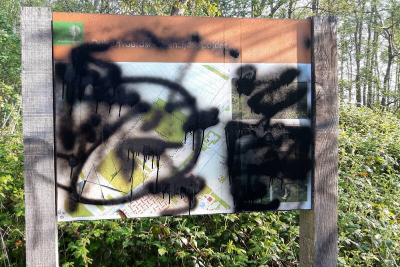 De Jeugd zit hier in de avond te blowen, laten afval achter en vonden het nodig om met sigaretten een kruis in de leuning te branden.