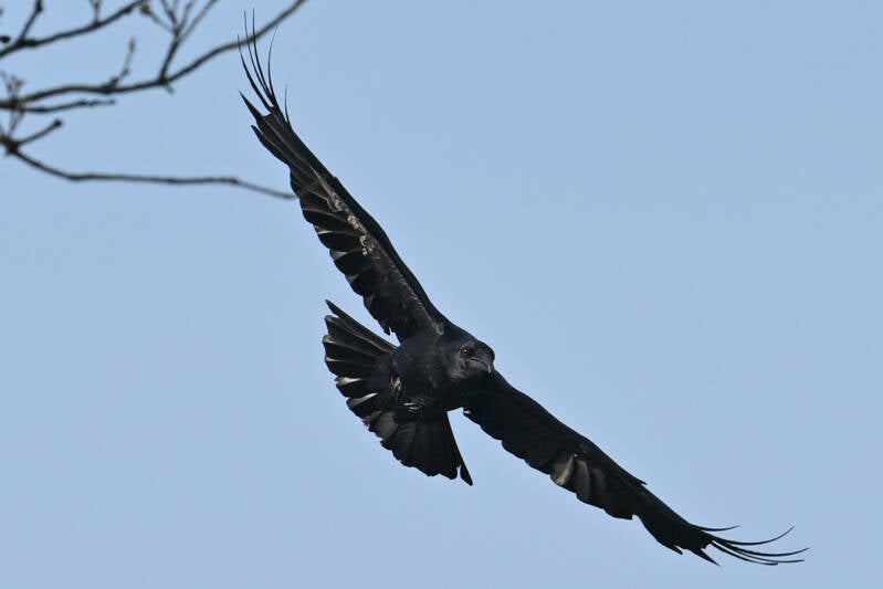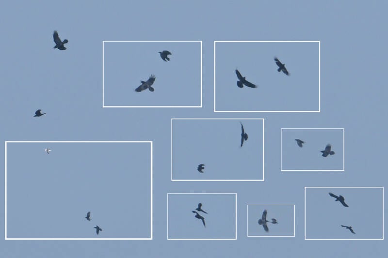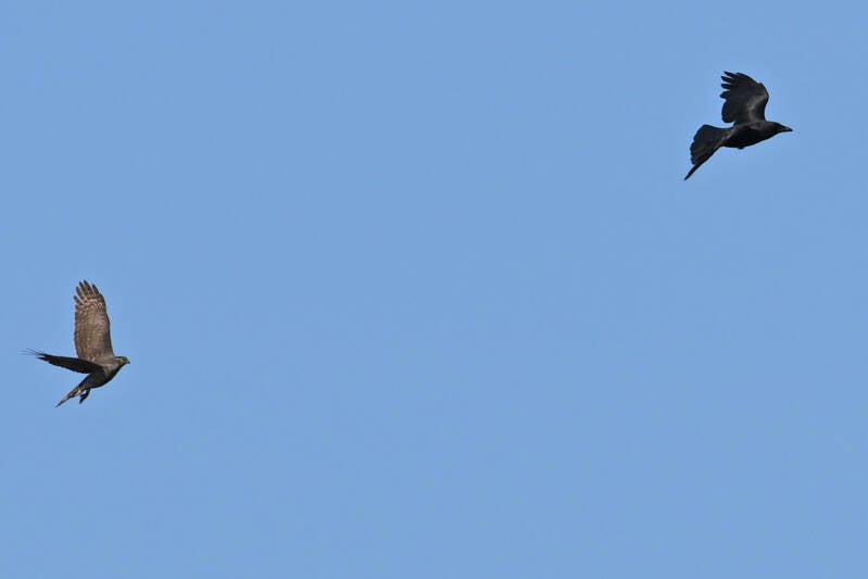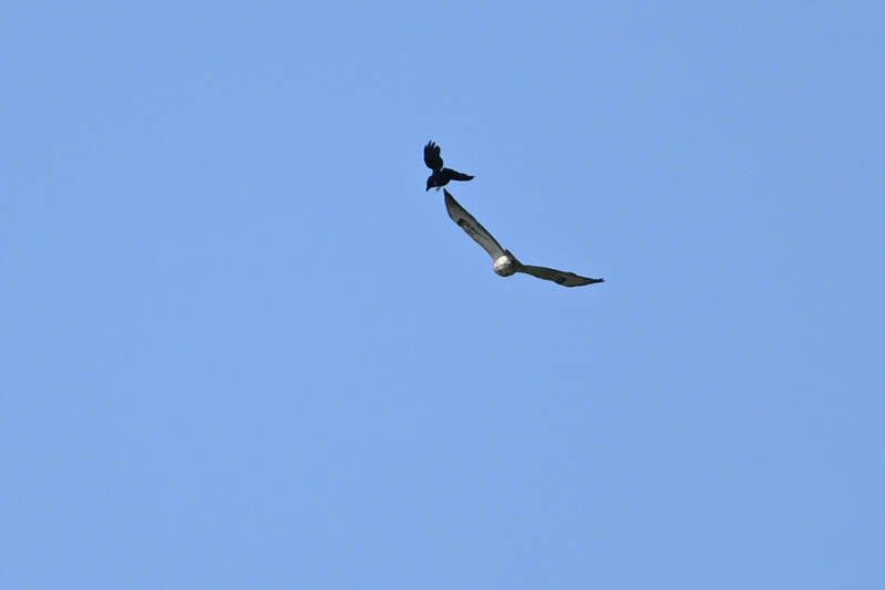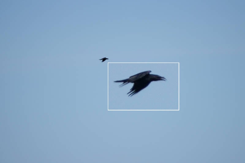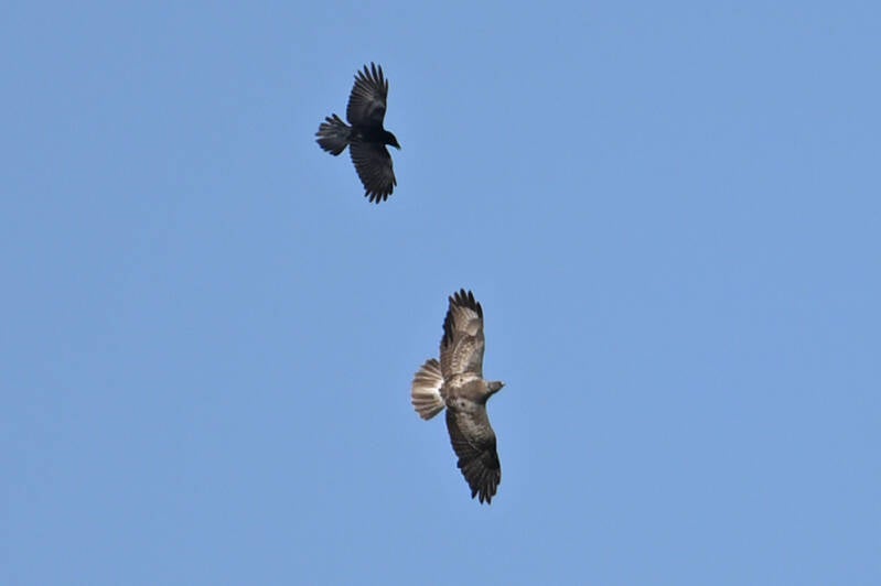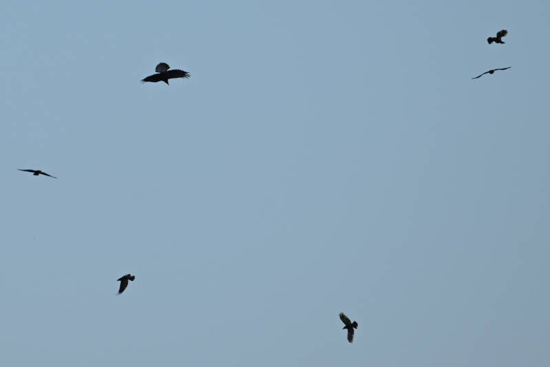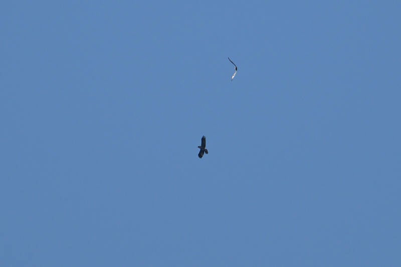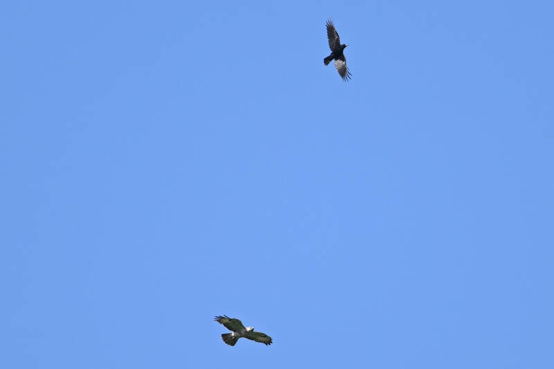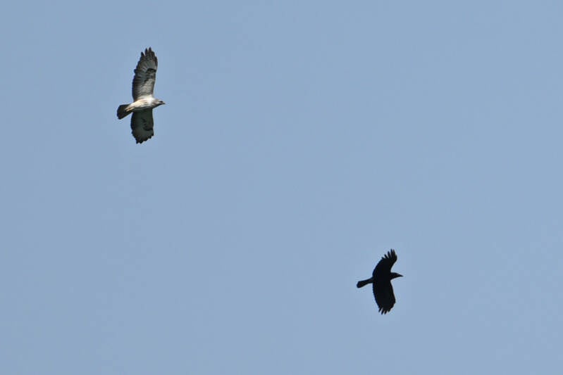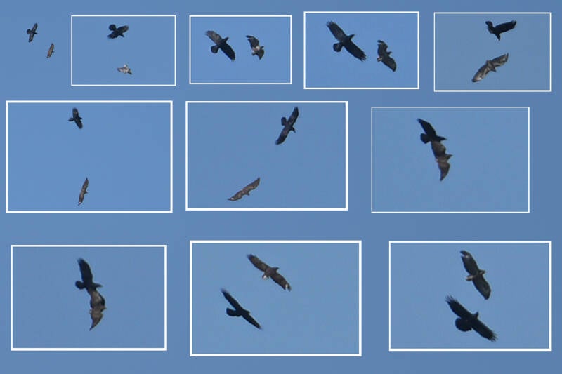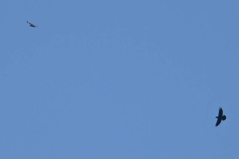 Hij besluit de bekende 'staartloze Buizerd' als doelwit te kiezen.....Staartloze Buizerd rechtsboven, Raaf rechtsonder :