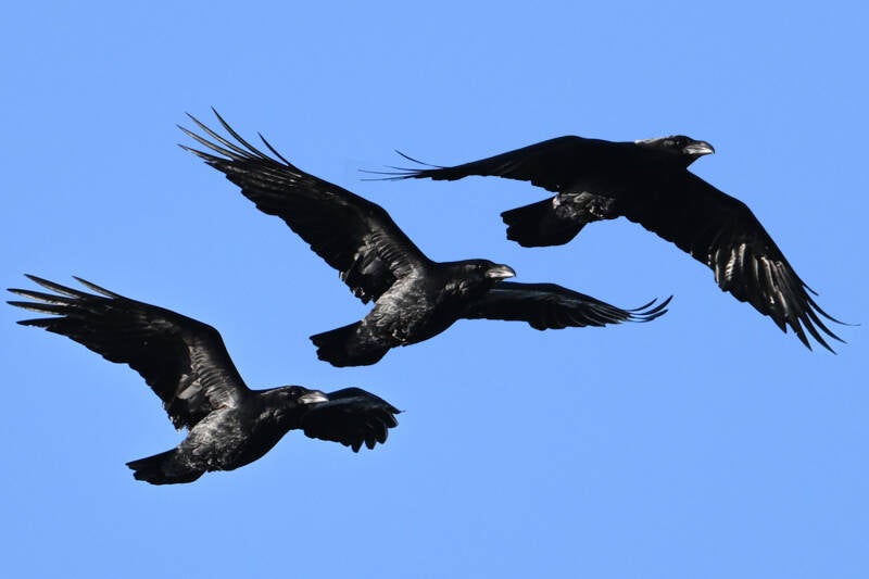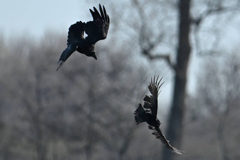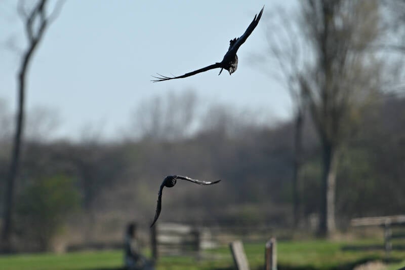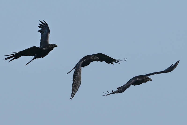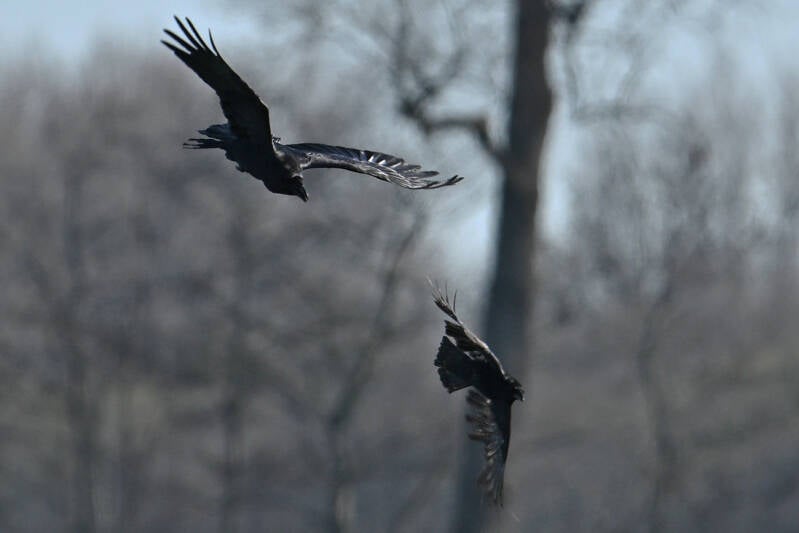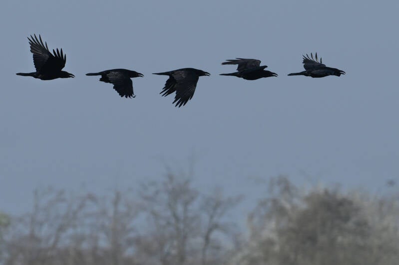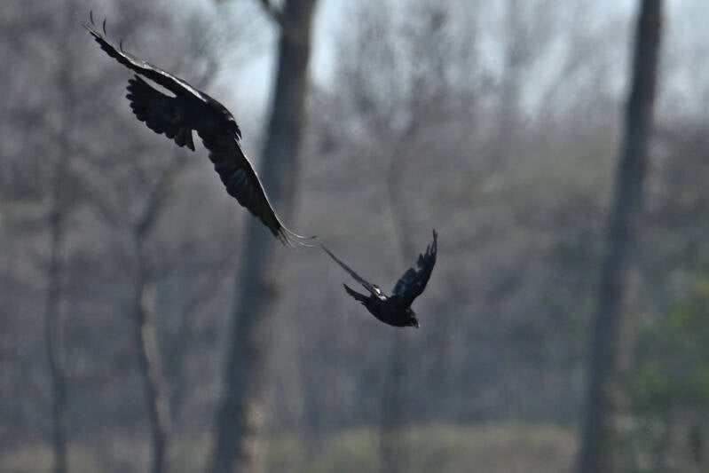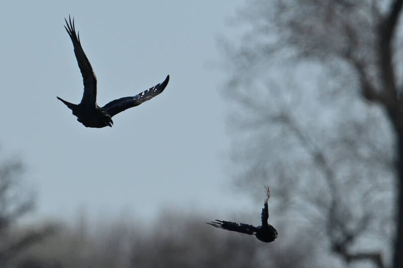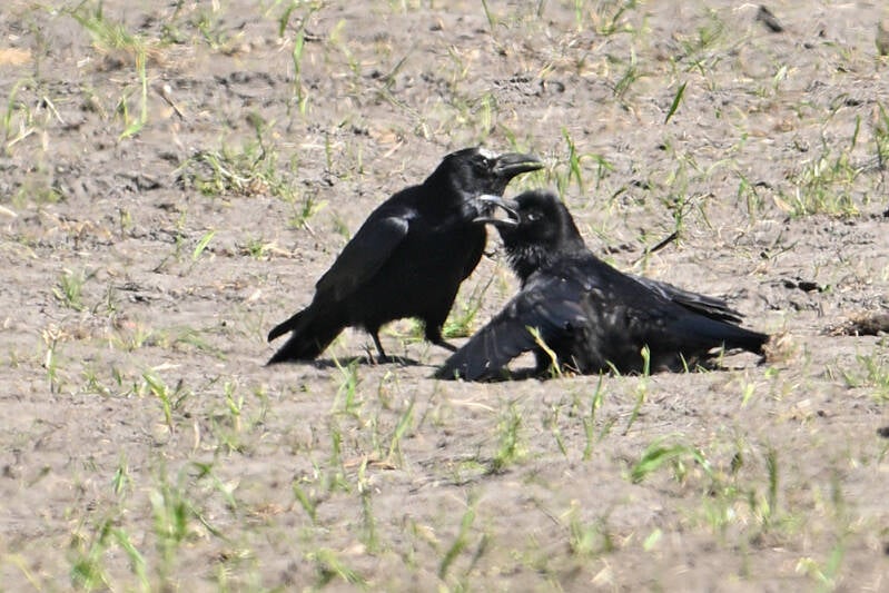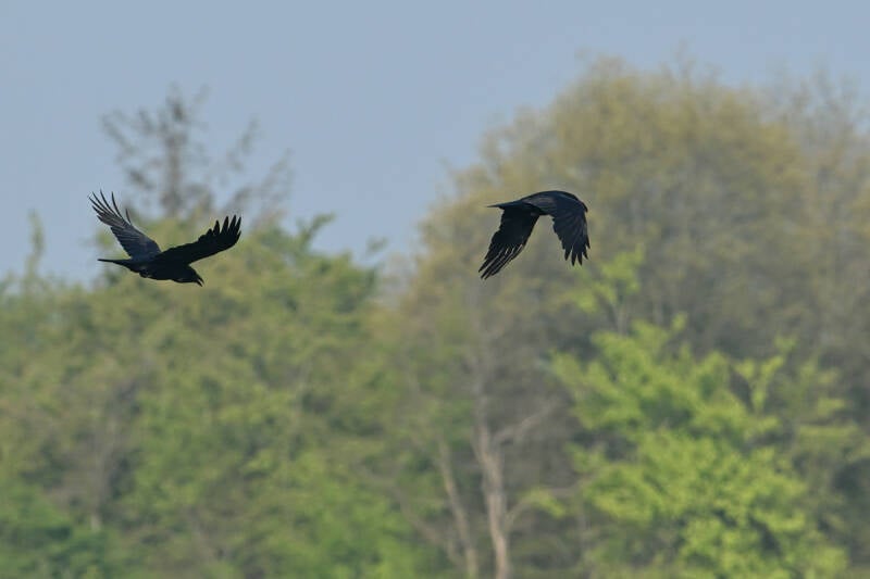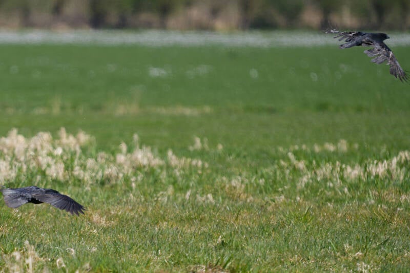 Iets later vliegen beide Raven op bij een slootrand waar ze mogelijk een bad hebben genomen :
