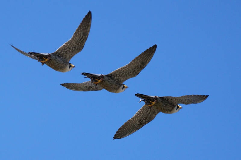 Mannetje Torenvalk en in beeld zijn ook de welbekende zwarte voorjaarsvliegjes te zien :