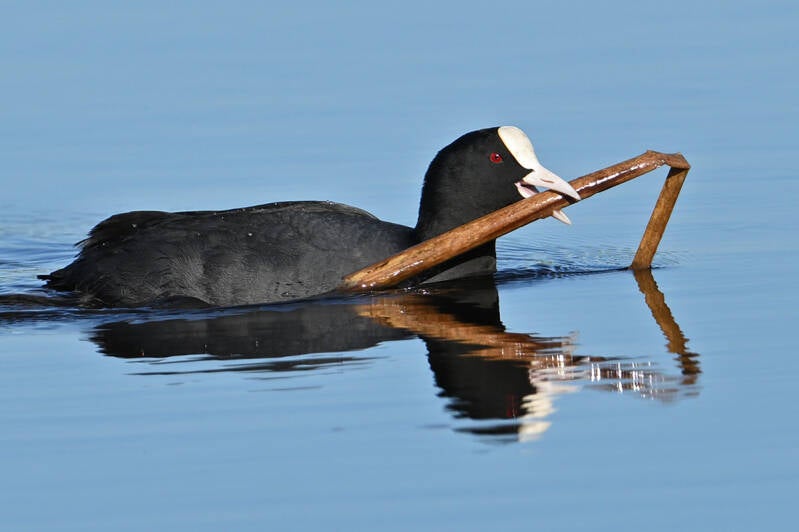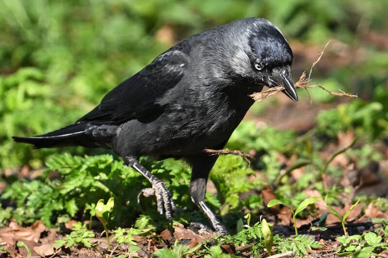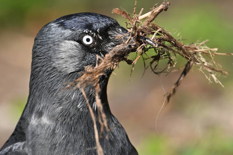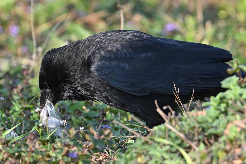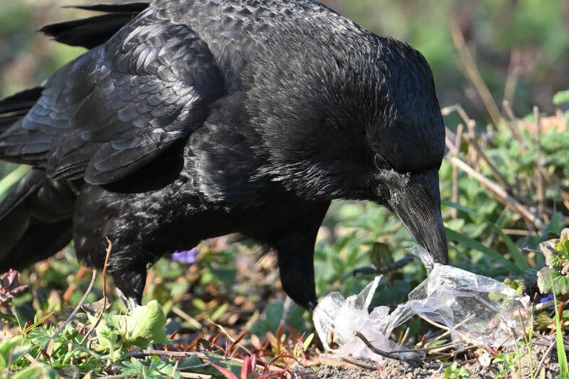 Zwarte Kraai verzamelt plastic nestmateriaal :