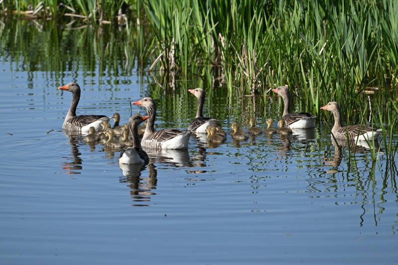 Twee paartjes Grauwe Ganzen met jongen en er zijn ook nog 2 volwassen exemplaren die gedoogd worden door de oudervogels.