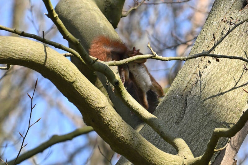 Een Eekhoorn is ook op de plastic-toer en heeft een vuilniszak in zijn nest verwerkt..;(