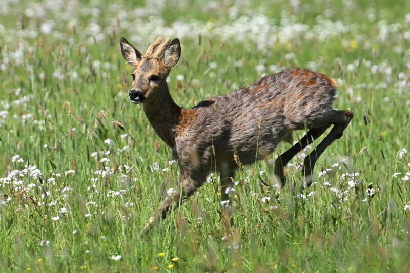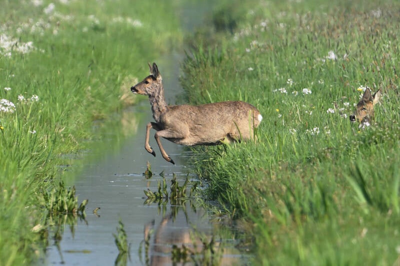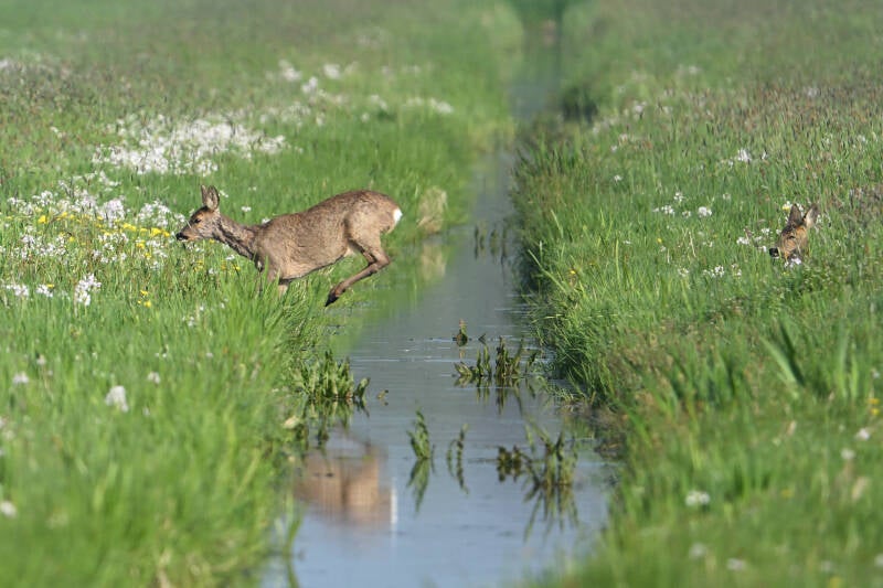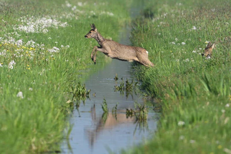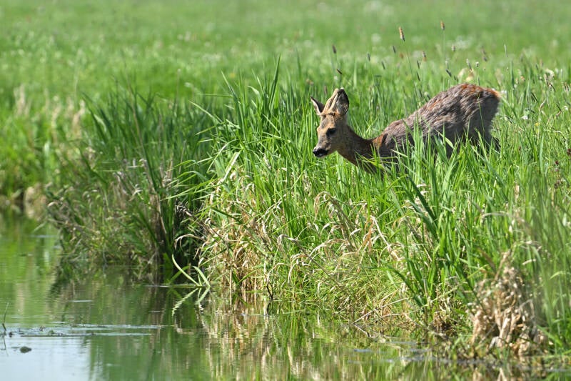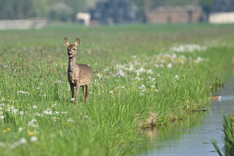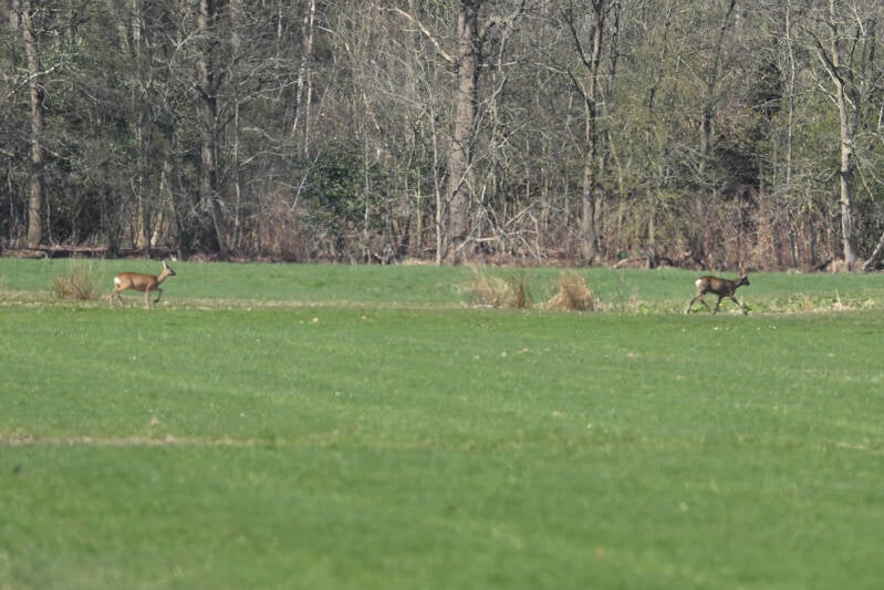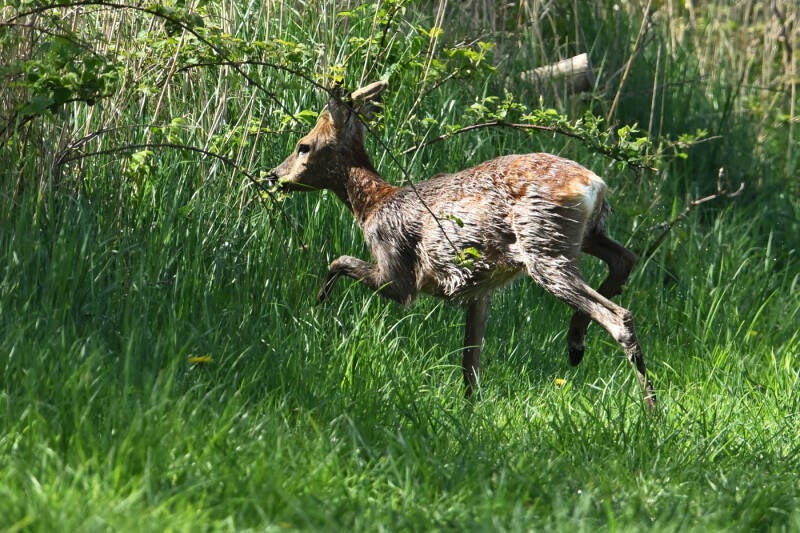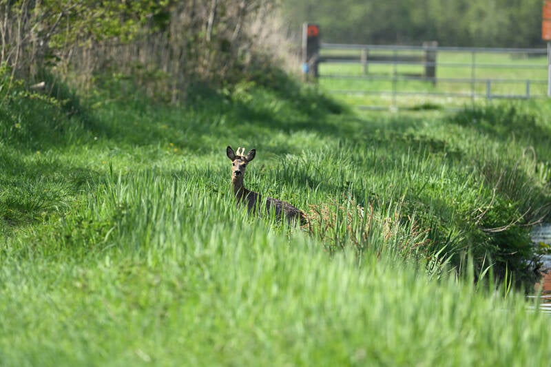 30 April : Een Reebok vlucht uit het hoge gras als een Boer onkruid aan het wieden is. Stuift dan mooi in mijn richting en steekt