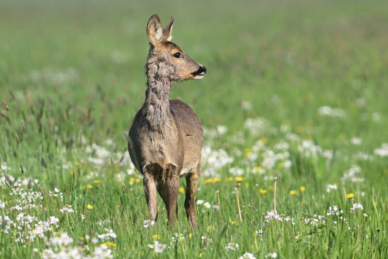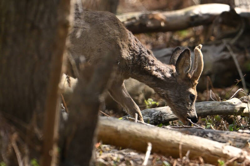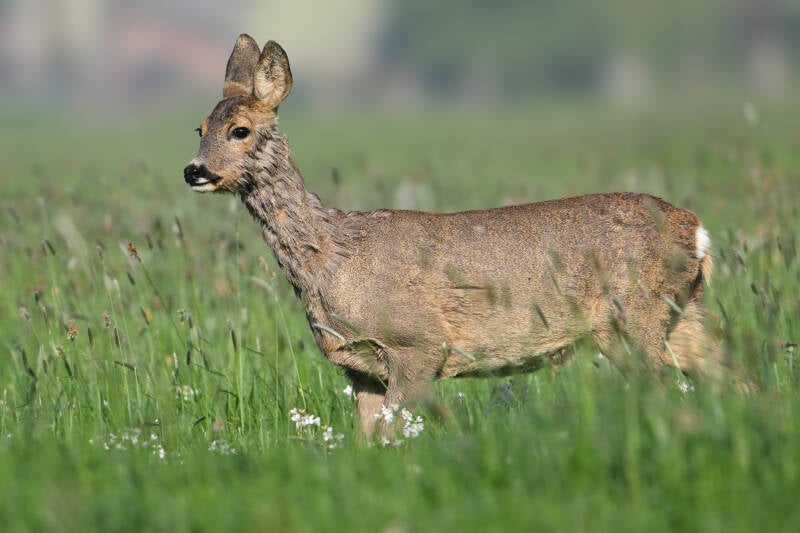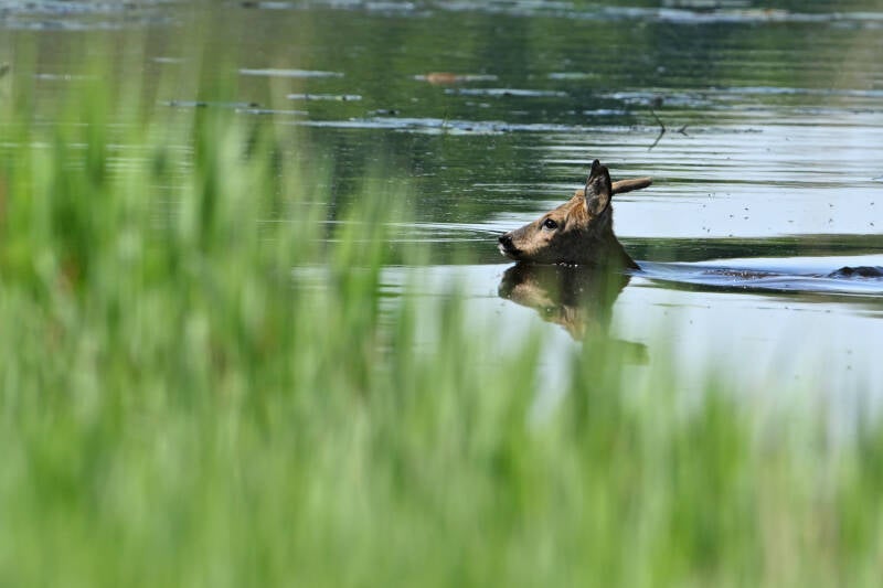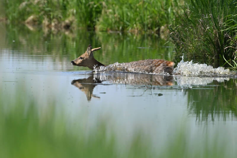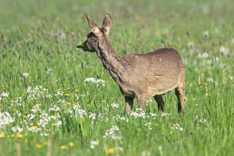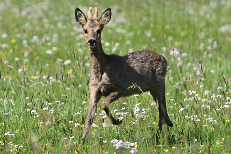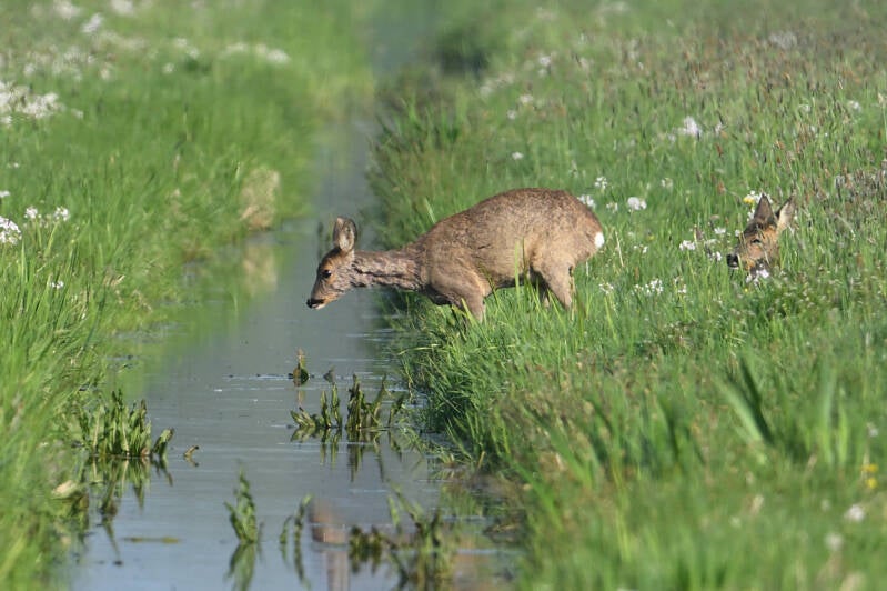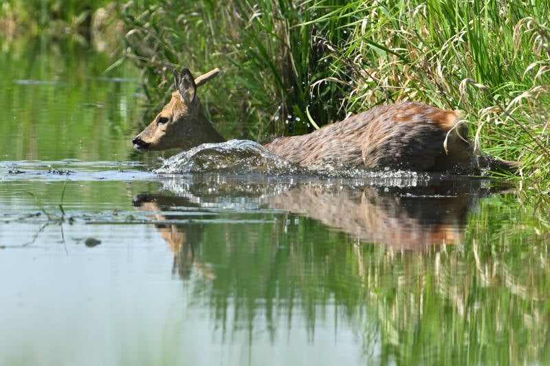 30 April : Een Reebok vlucht uit het hoge gras als een Boer onkruid aan het wieden is. Stuift dan mooi in mijn richting en steekt