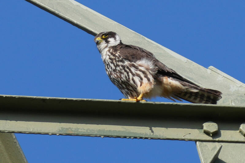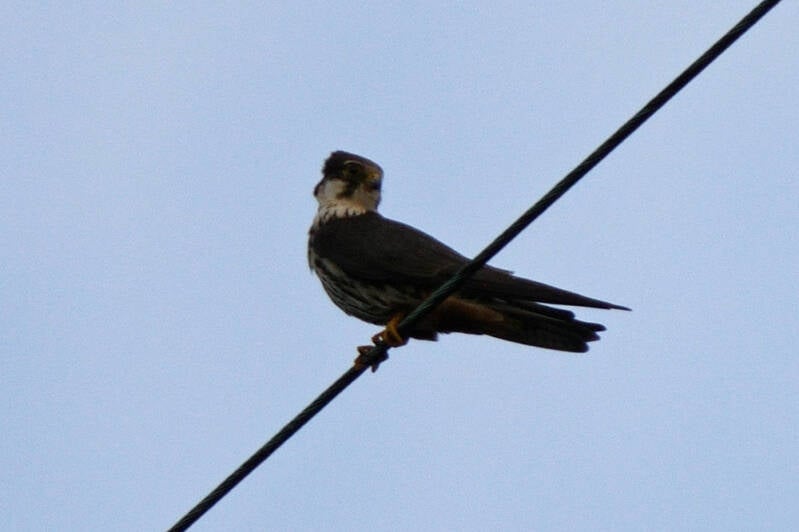 6 Juli : Deze Boomvalk verschijnt voornamelijk in de vroege ochtend op een mast vlakbij huis, maar vandaag laat hij zich
