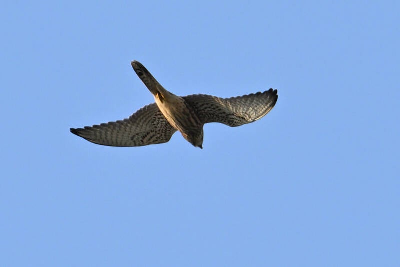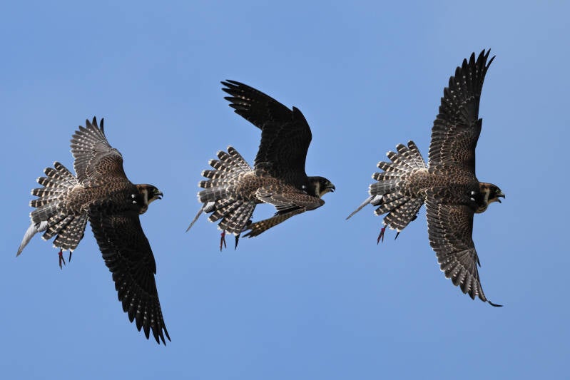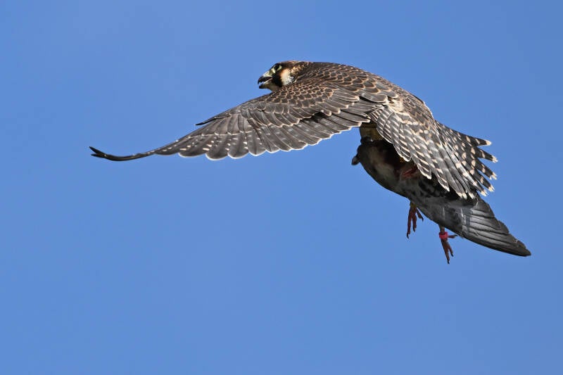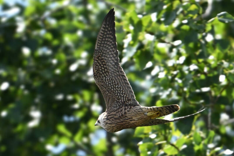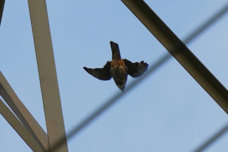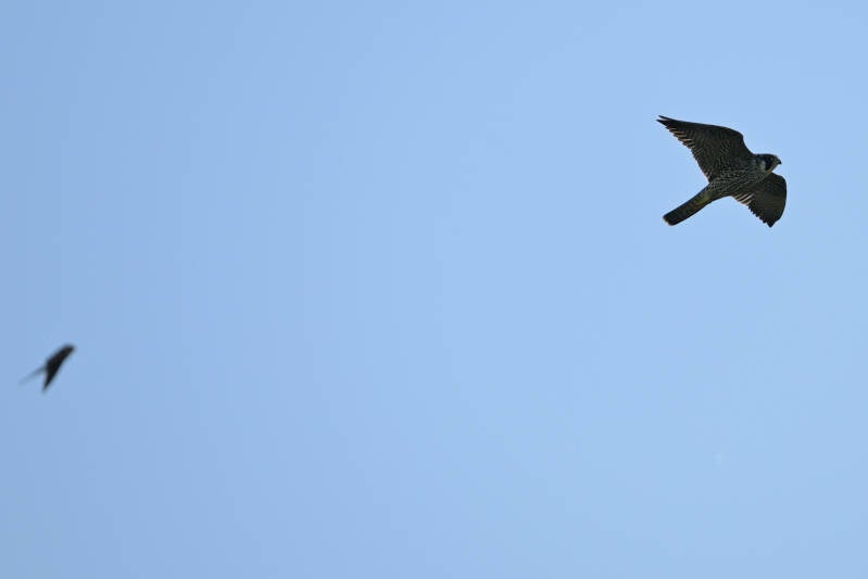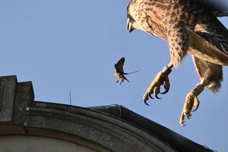 Jonge Valk maakt snoekduik tijdens het kansloos achtervolgen van een Houtduif die laag over de schuren voorbij kwam.