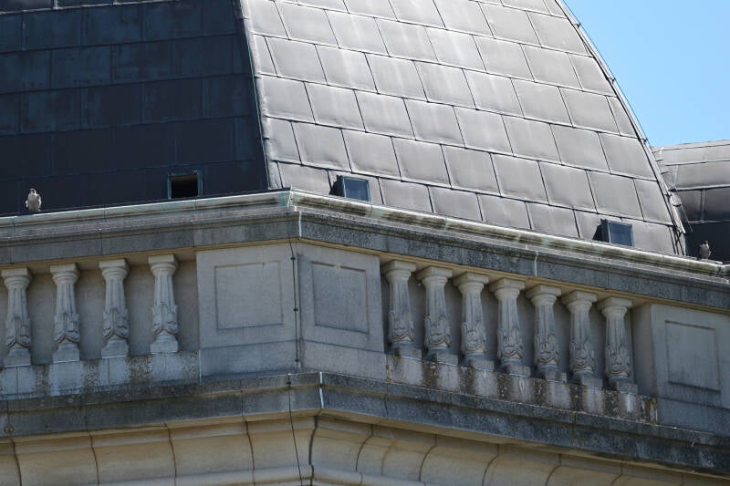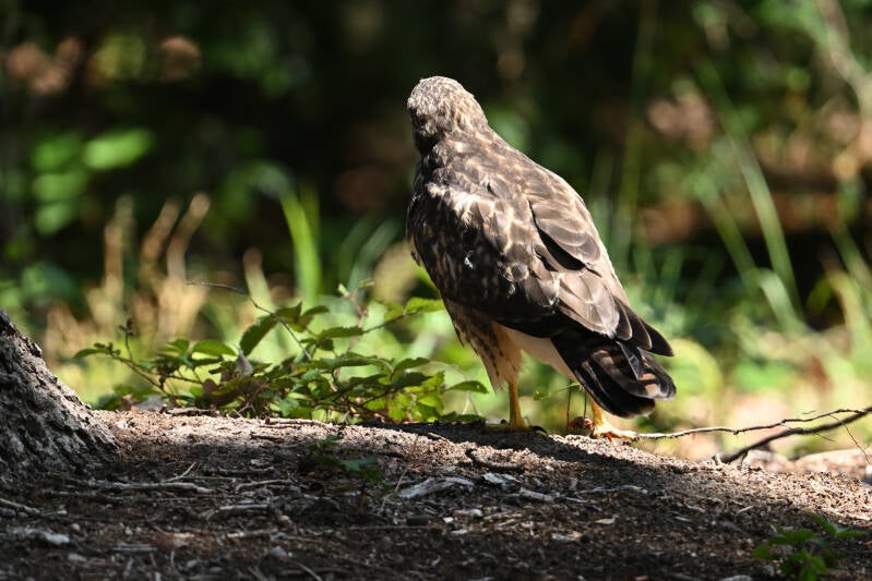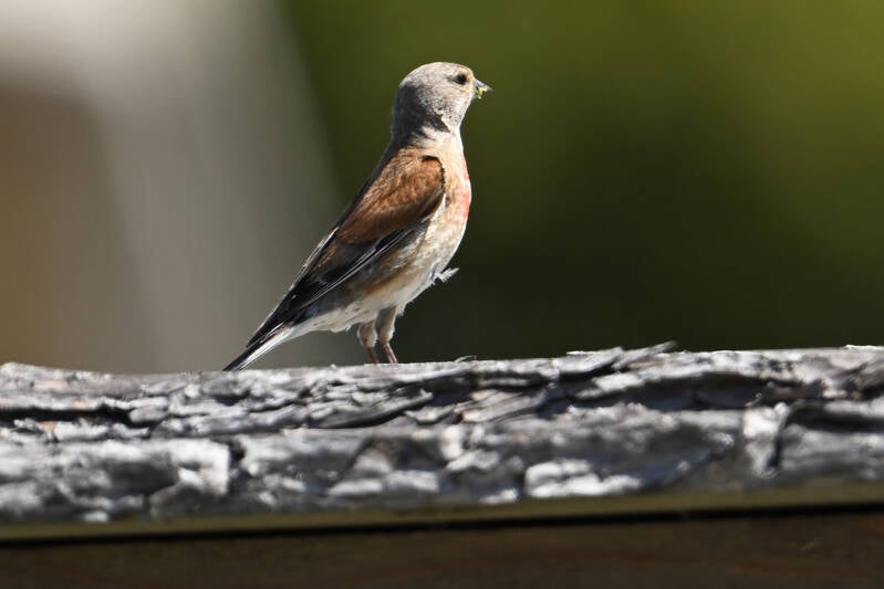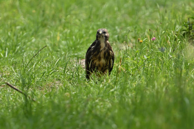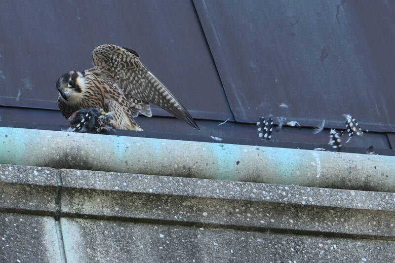 Alo is op één van de schuren verschenen met een duif. Aanvankelijk zit ze een half uur buiten beeld achter de nok te dineren.
