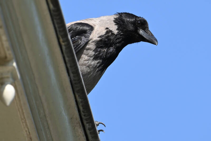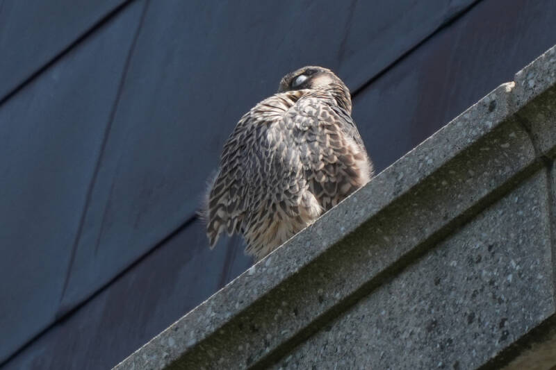 Pietje zit op de dakgoot en geheel rechts om de hoek is nog net een jong mannetje snurkend op de dakgoot zichtbaar :