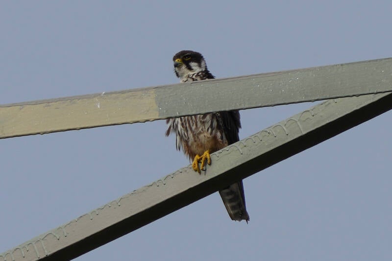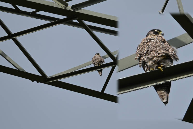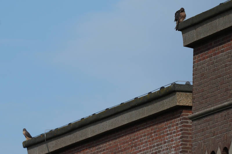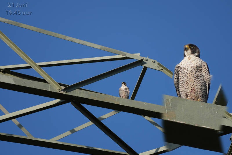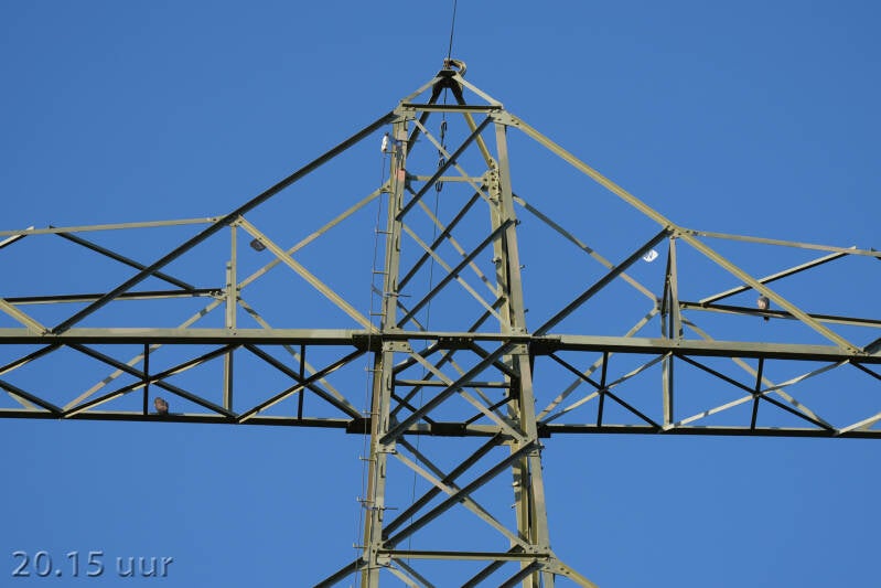 -Rond 6.00 uur vanuit het raam met de telescoop 2 Boomvalken op een mast. Ze zitten hier wel vaker maar overdag zie ik ze nooit.