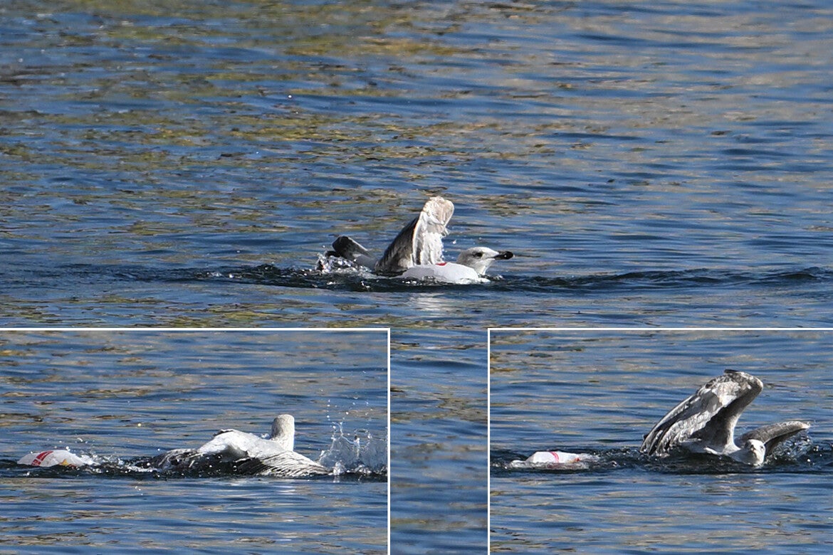 De plastic zak heeft een soort sluiting met een koordje en dat zit om de poten van de Meeuw verstrikt.;(