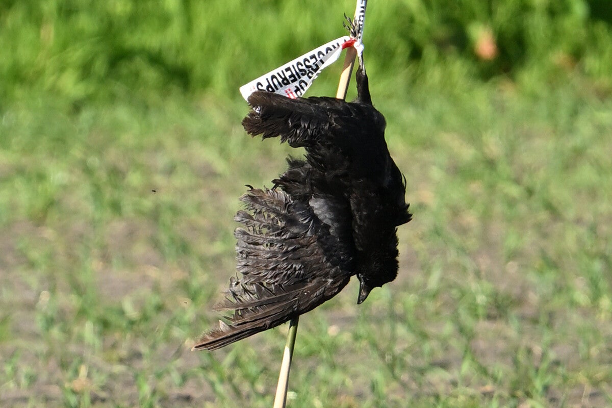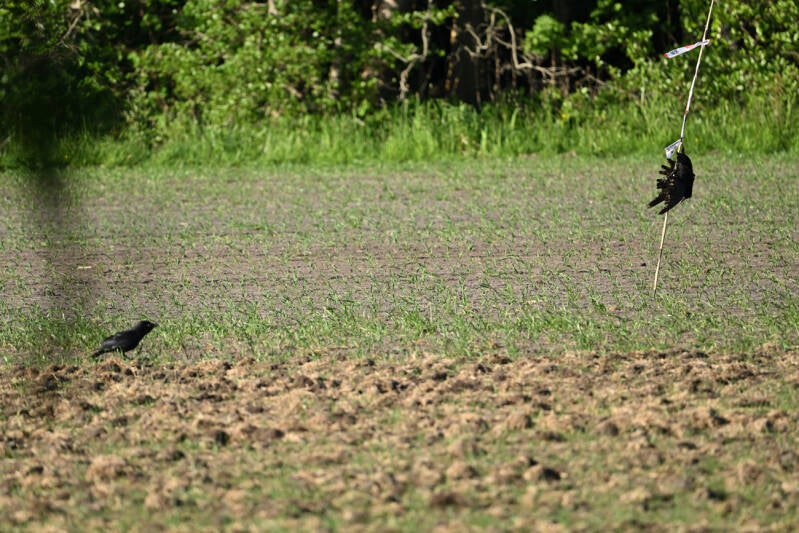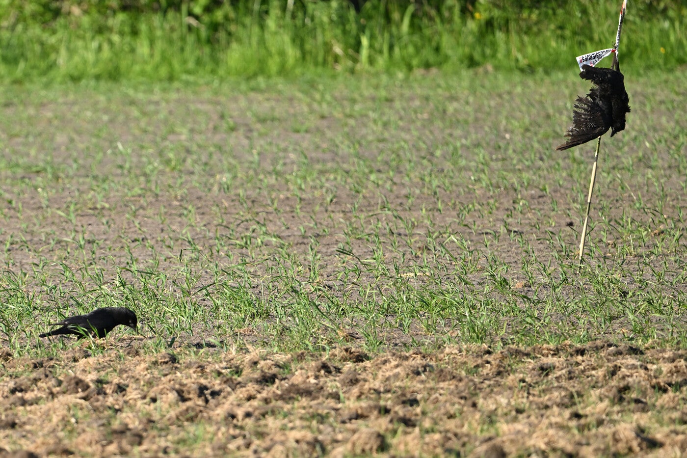 Totaal 4 Zwarte Kraaien zijn afgeslacht in opdracht van ons weinig snuggere Staatshoofd, en zijn opgehangen rondom het ingezaaide maisveld :