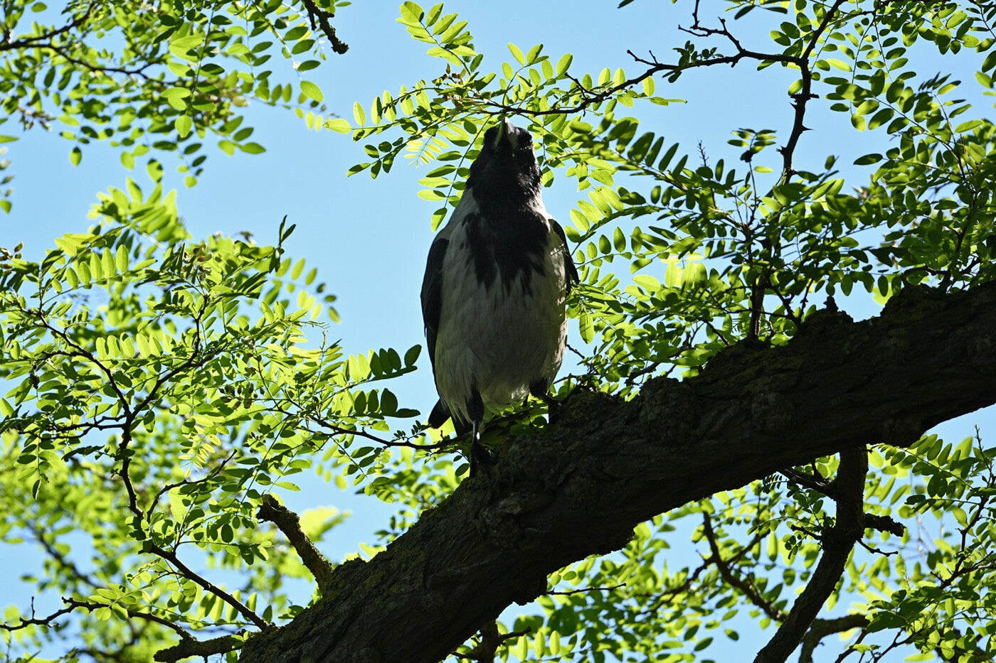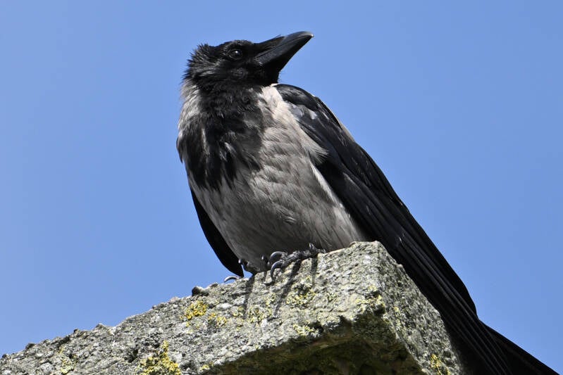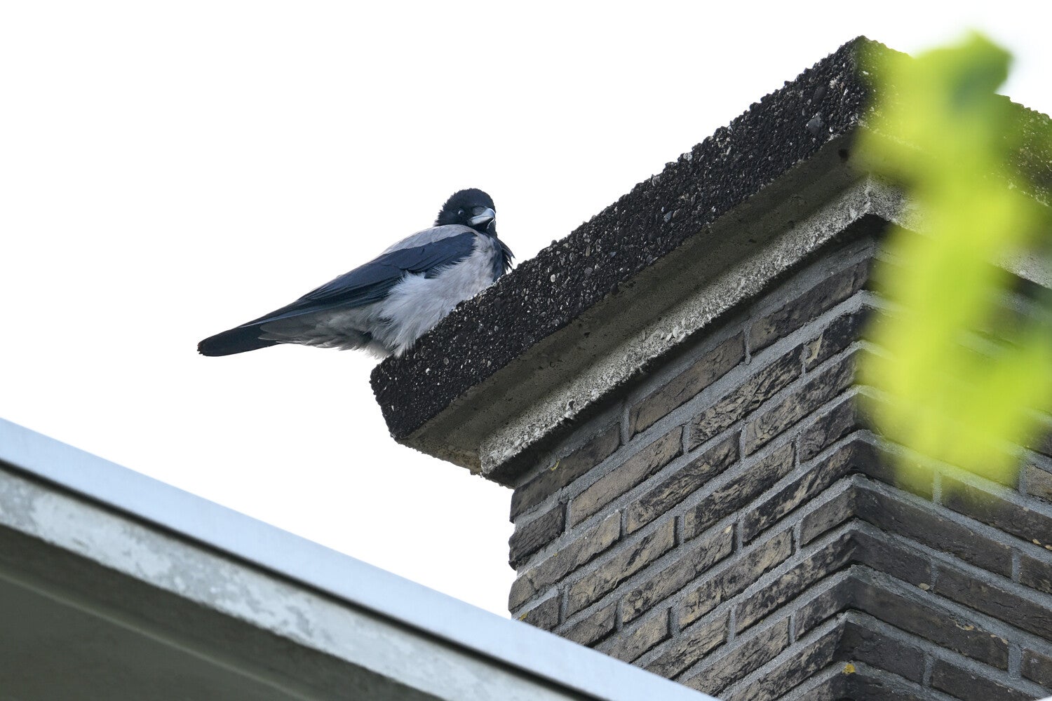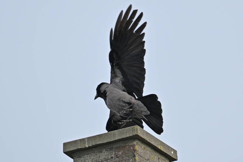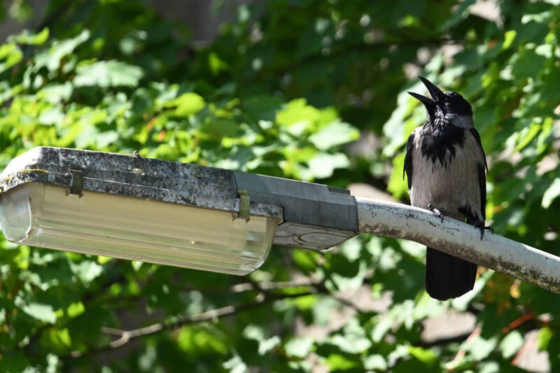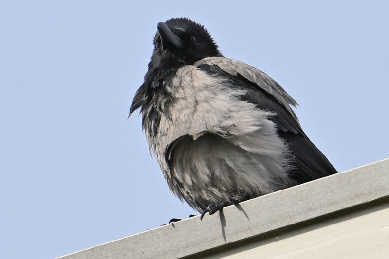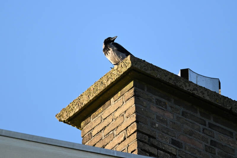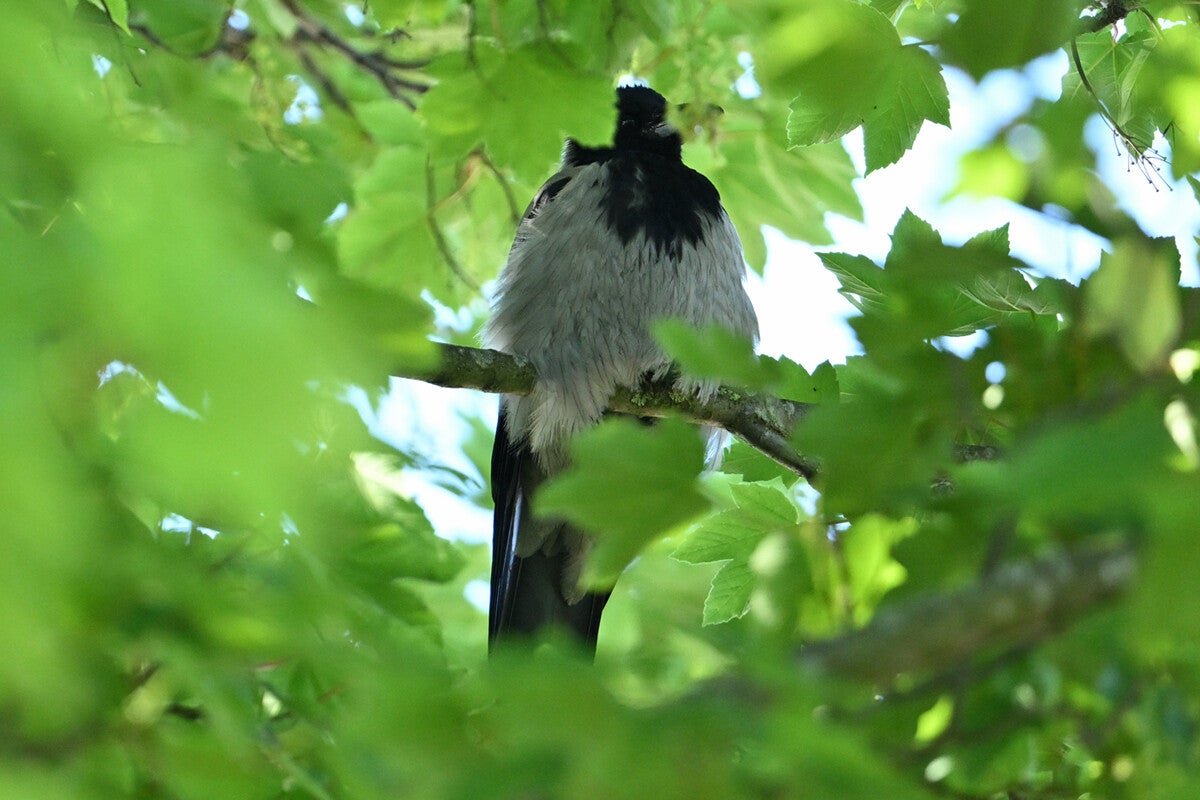 De Zwarte Kraai van mast 17 zit met open snavel te broeden.