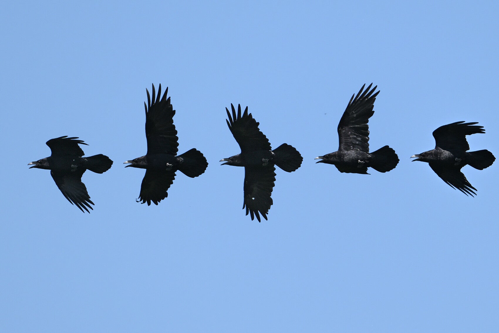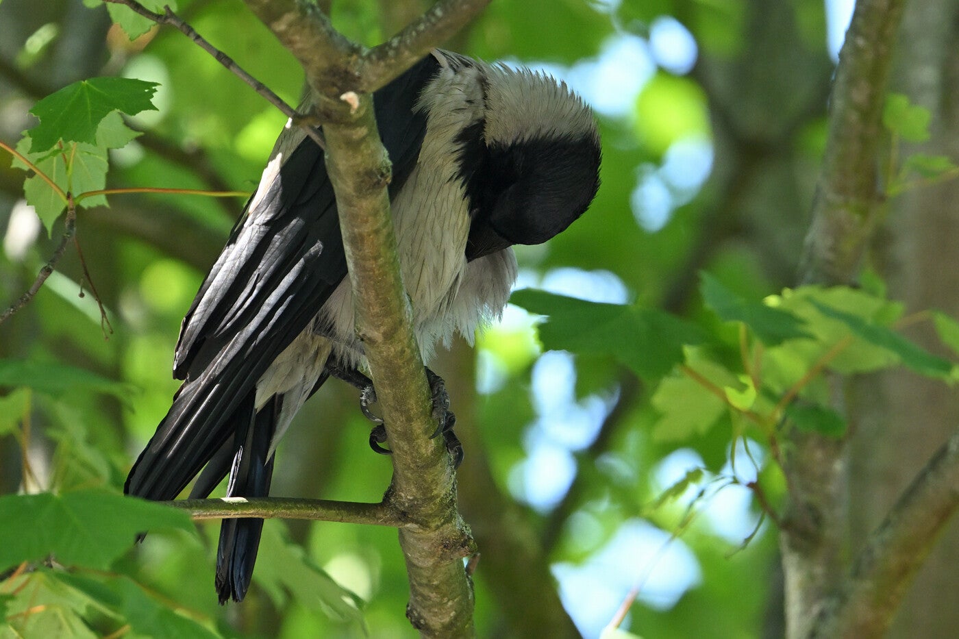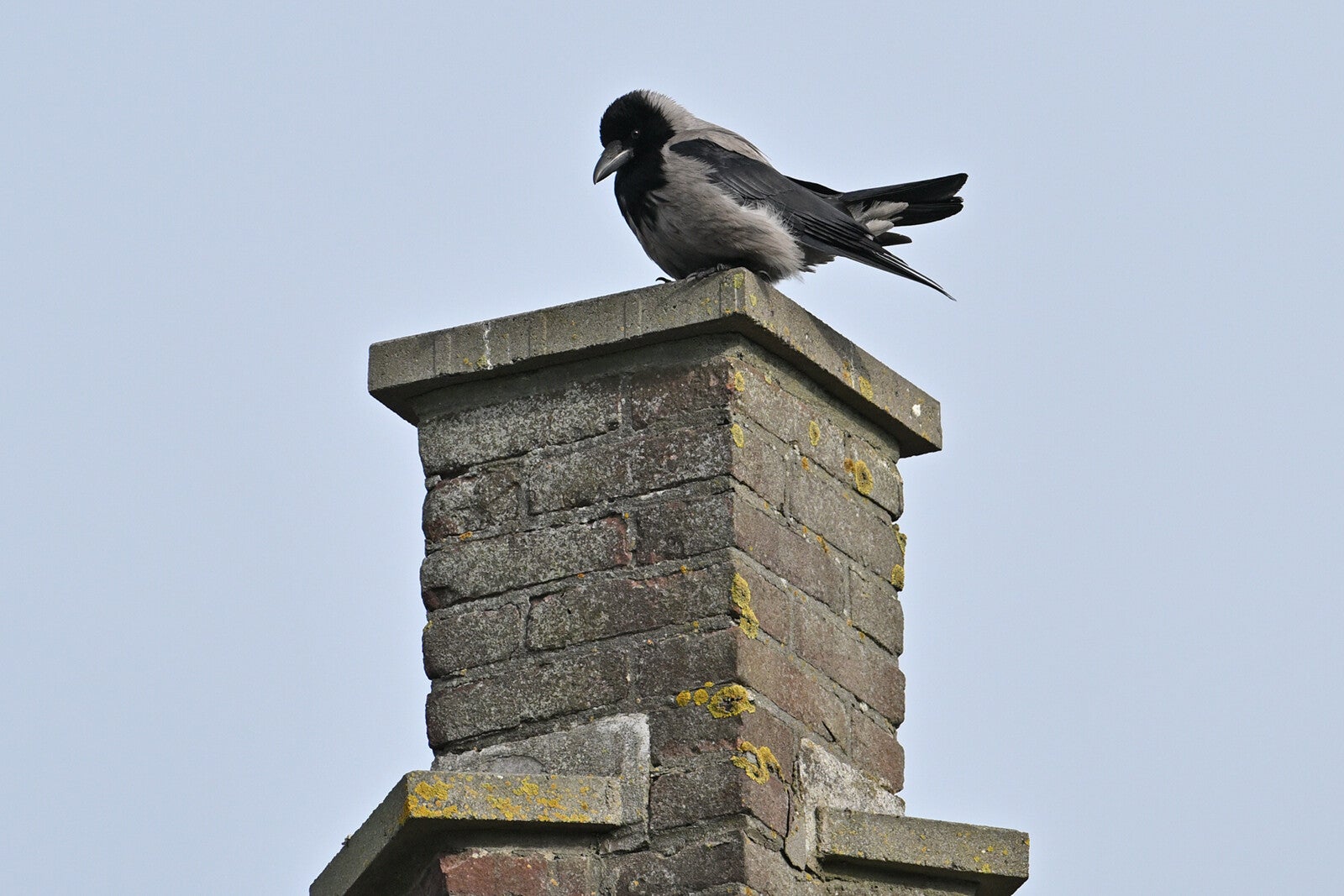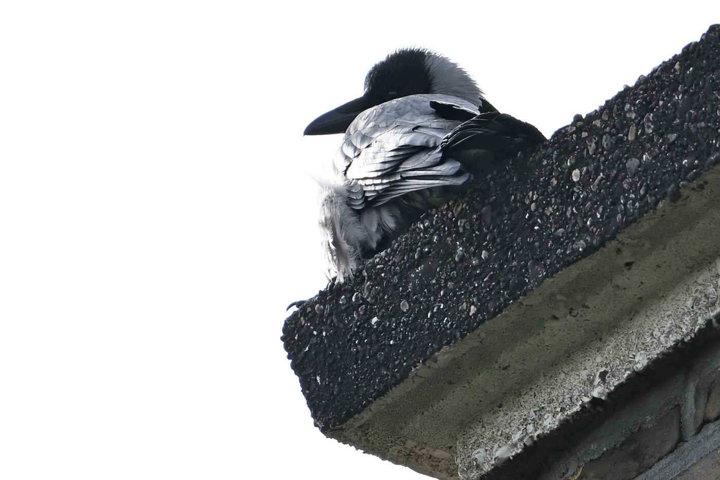 De Zwarte Kraai van mast 17 zit met open snavel te broeden.