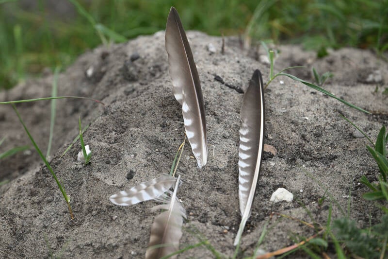 Sporen van een Groene Specht....De veren tonen grote gelijkenis met sommige roofvogelveren :