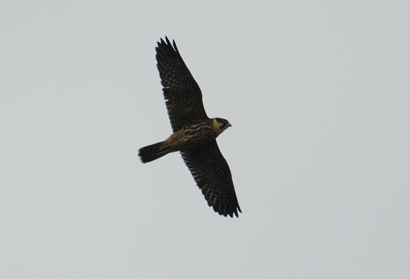 Het vliegbeeld van de jonge Boomvalken is makkelijk te onderscheiden van de volwassen vogels door de stompe vleugels