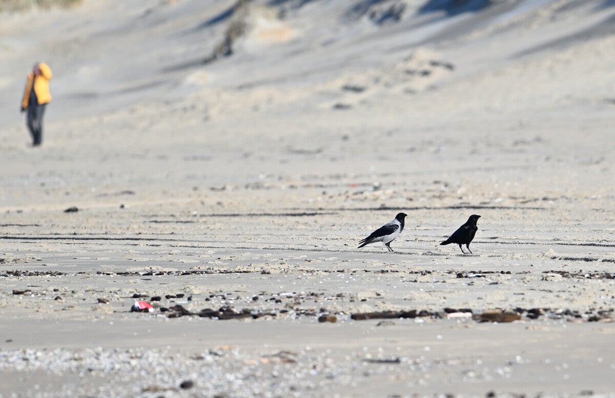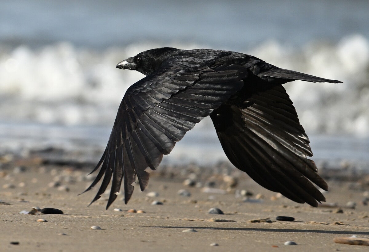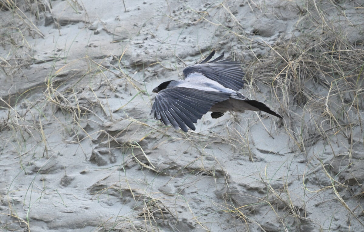 Als ik boven aan de strandopgang sta, vliegt de Bonte Kraai hoog over richting Lentevreugd....(Beelden op de korte video geheel onderaan)