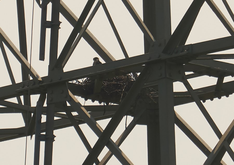 Van grote afstand genomen en zeer onduidelijk, maar het zijn echt parende Boomvalken op de hoogste dwarsligger van mast 17!