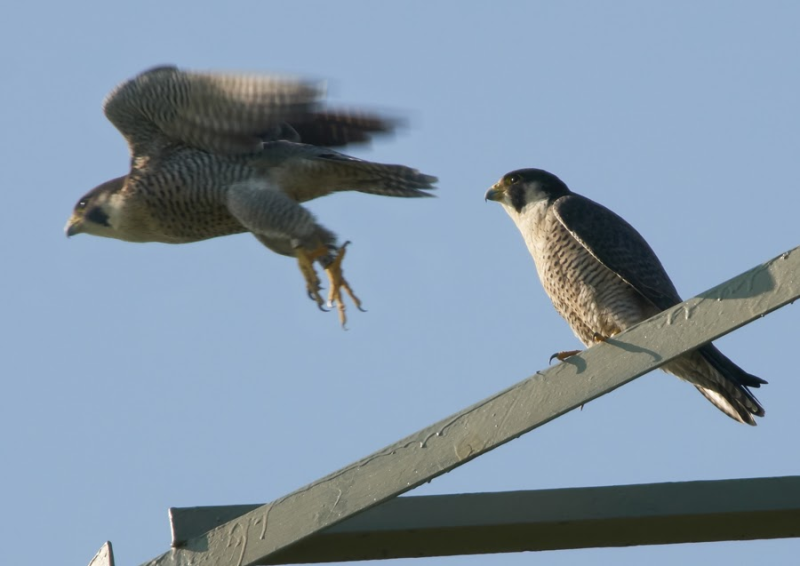 Binnen 5 minuten is ze terug met een Duif en vliegt richting mast 18.....Ze alarmeert met de buit in de klauwen :