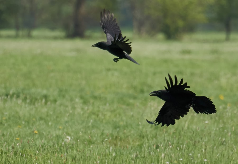 Uit de verte komt het koppel Raven over de weilanden gevlogen...;