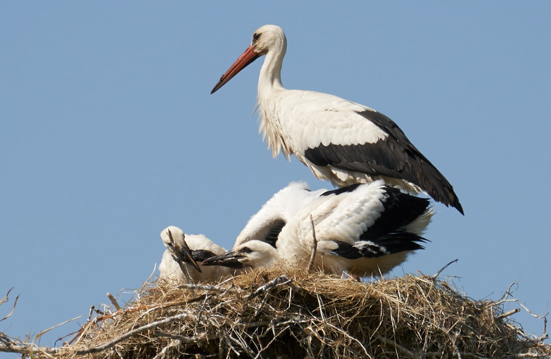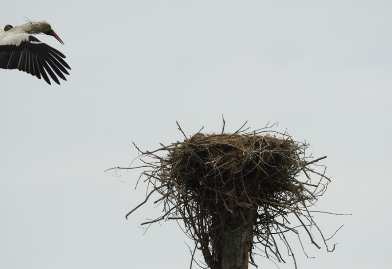Op een ander mast-nest is een jong al flink aan de wandel..: