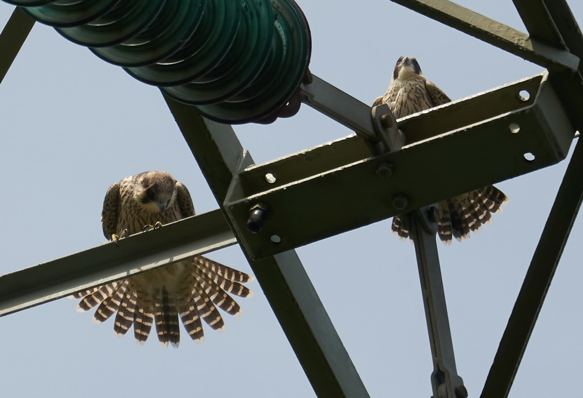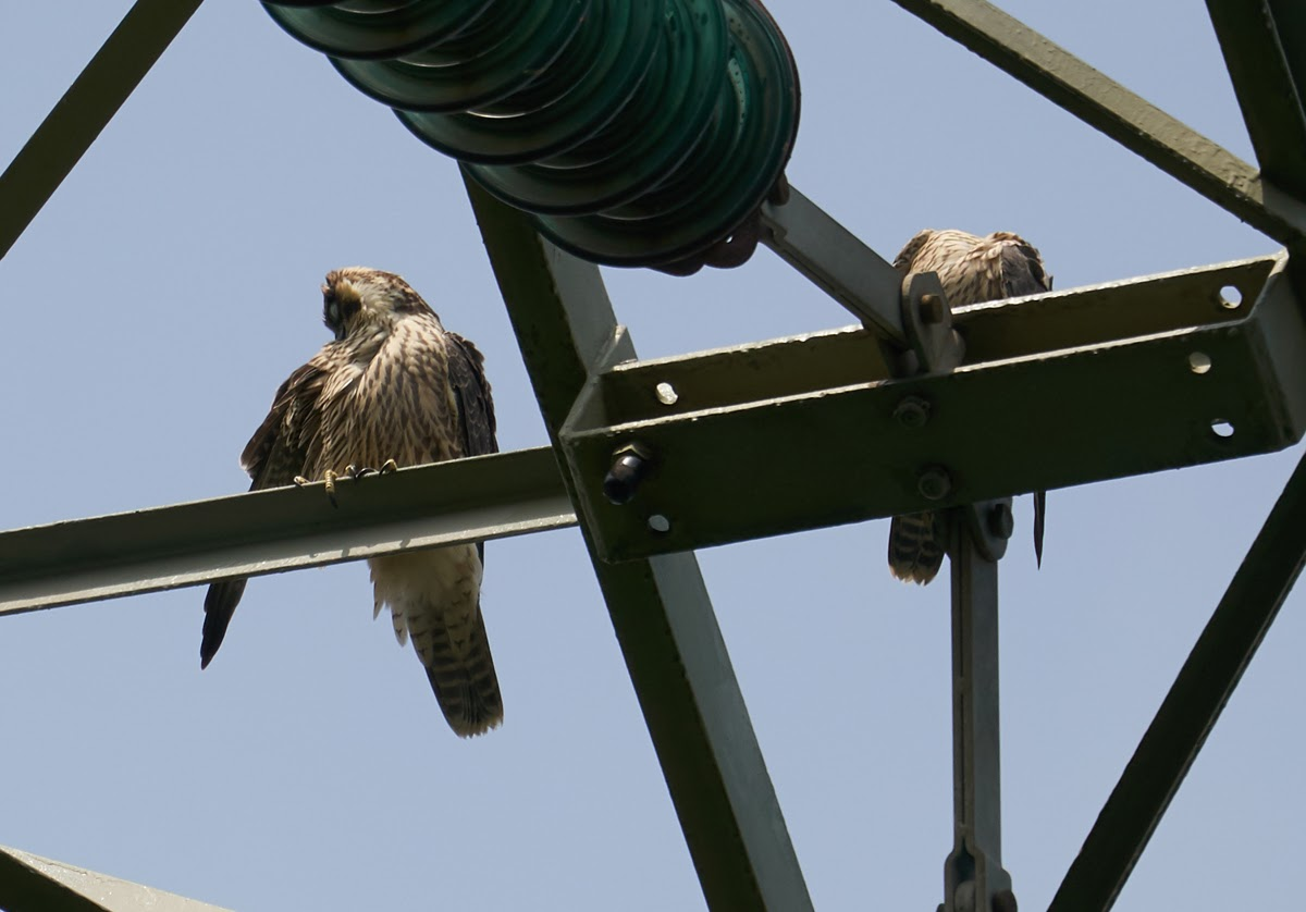 Slechtvalken zitten vrijwel nooit op de hoogste kabelgeleider, dit is een zeldzaam gekozen zetel :