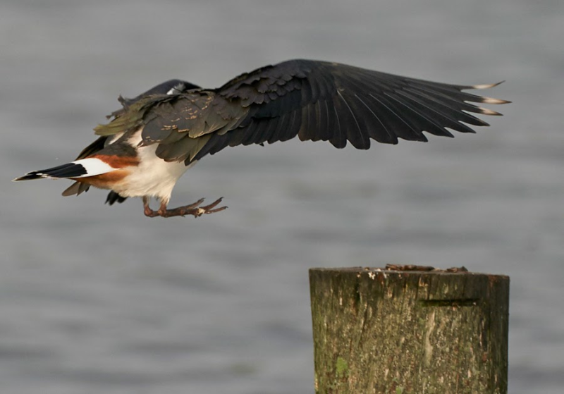 Na een korte jachtvlucht in de Polder keert hij terug met een kleine prooi onder de staart :