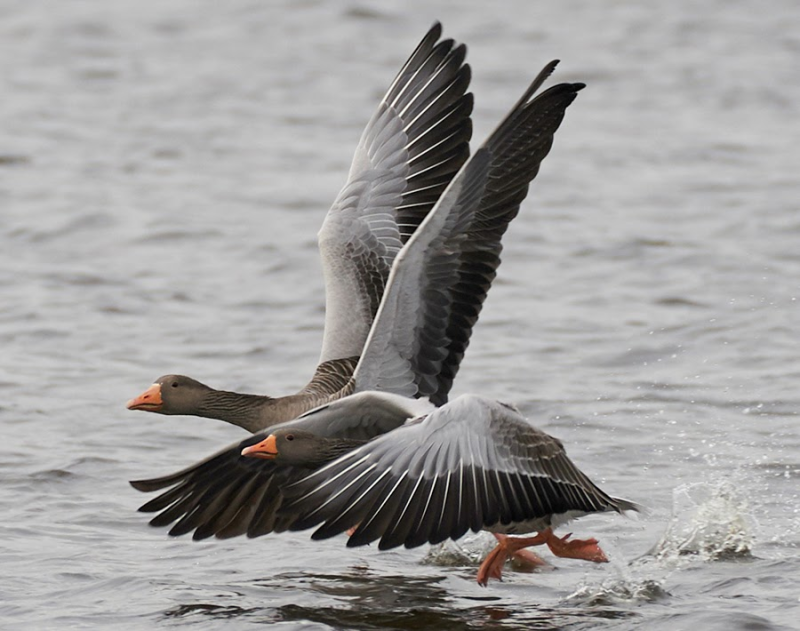 Twee Grauwe Ganzen in de typische vertrekhouding....Opstijgmoment is nabij :