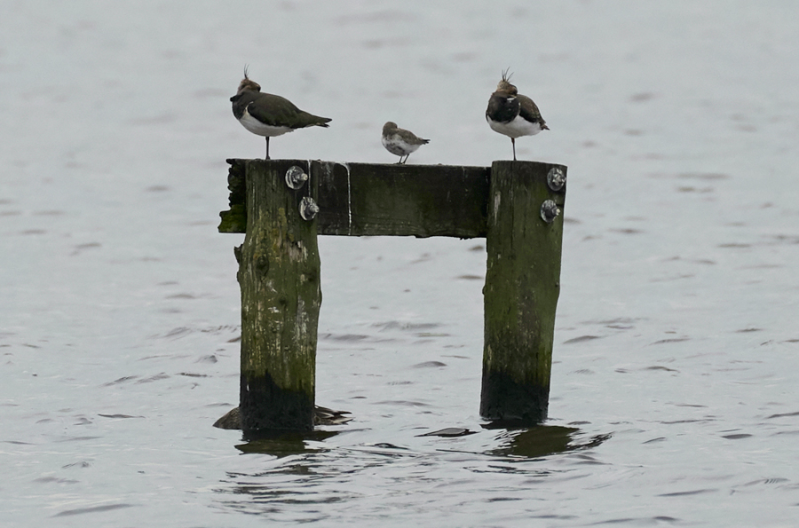 Twee Kieviten kregen langdurig gezelschap van een Bonte Strandloper :