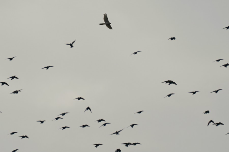 Een Sperwer vrouwtje zat zonder succes achter Spreeuwen aan :