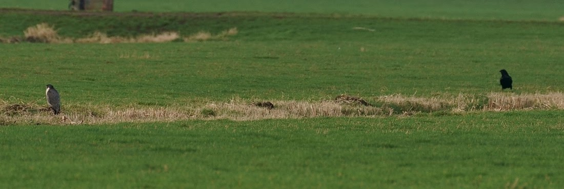 De Raaf doet alsof hij gewoon foerageert, maar in feite heeft hij een cache van de Slechtvalk op het oog...:-)