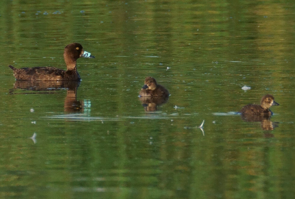 Waaks vrouwtje Kuifeend met 4 vliegvlugge jongen :