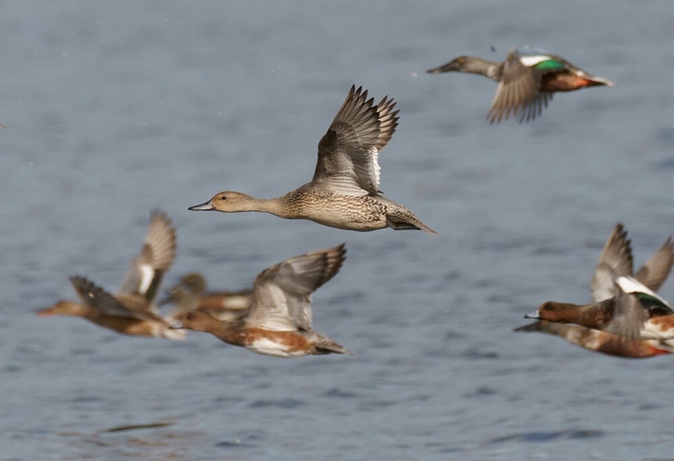 Mix van Smienten, Slobeenden, Kieviten en man Pijlstaart :