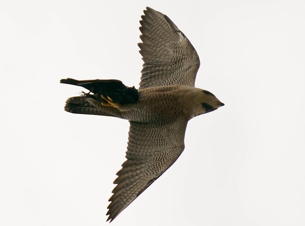-Bij aankomst tref ik direct het vrouwtje Slechtvalk (L) als ze een andere Roofvogel langdurig nazit :