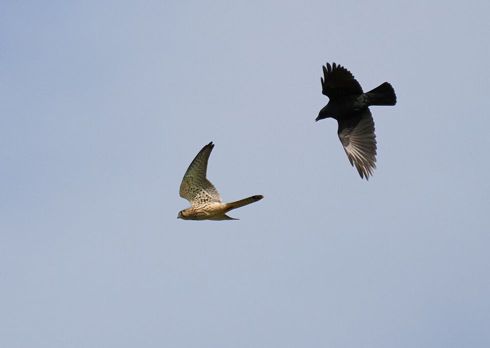 Verderop wordt de jonge Torenvalkdame geplaagd door een Kauwtje :