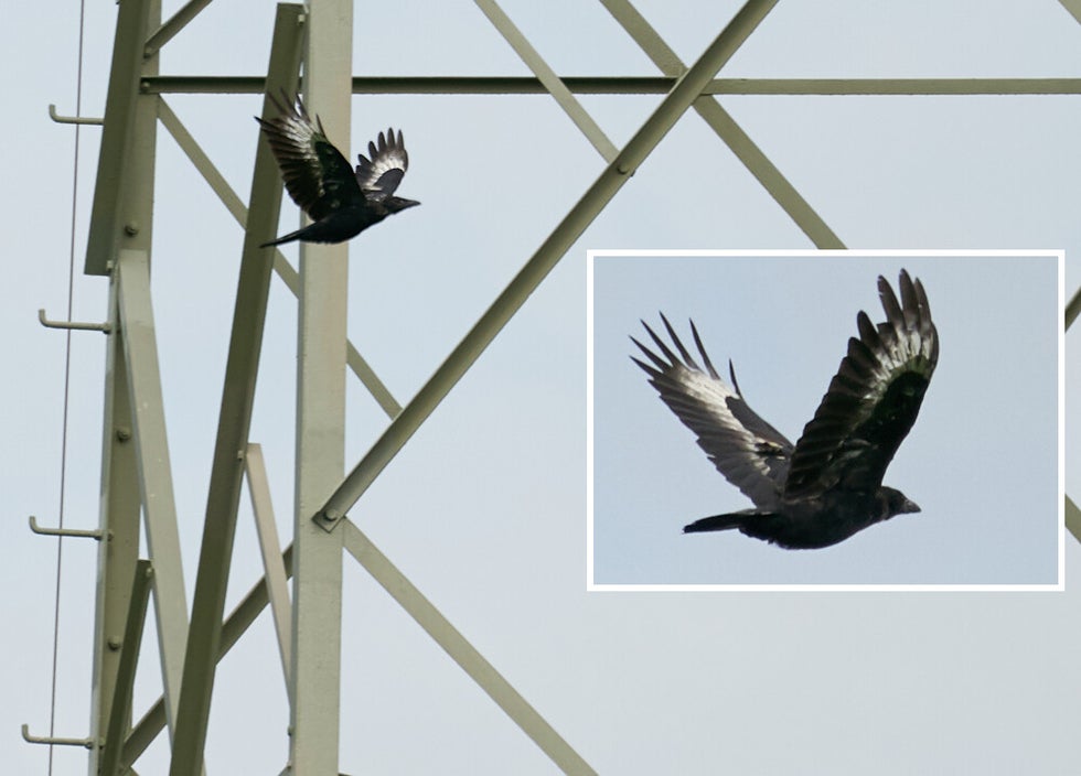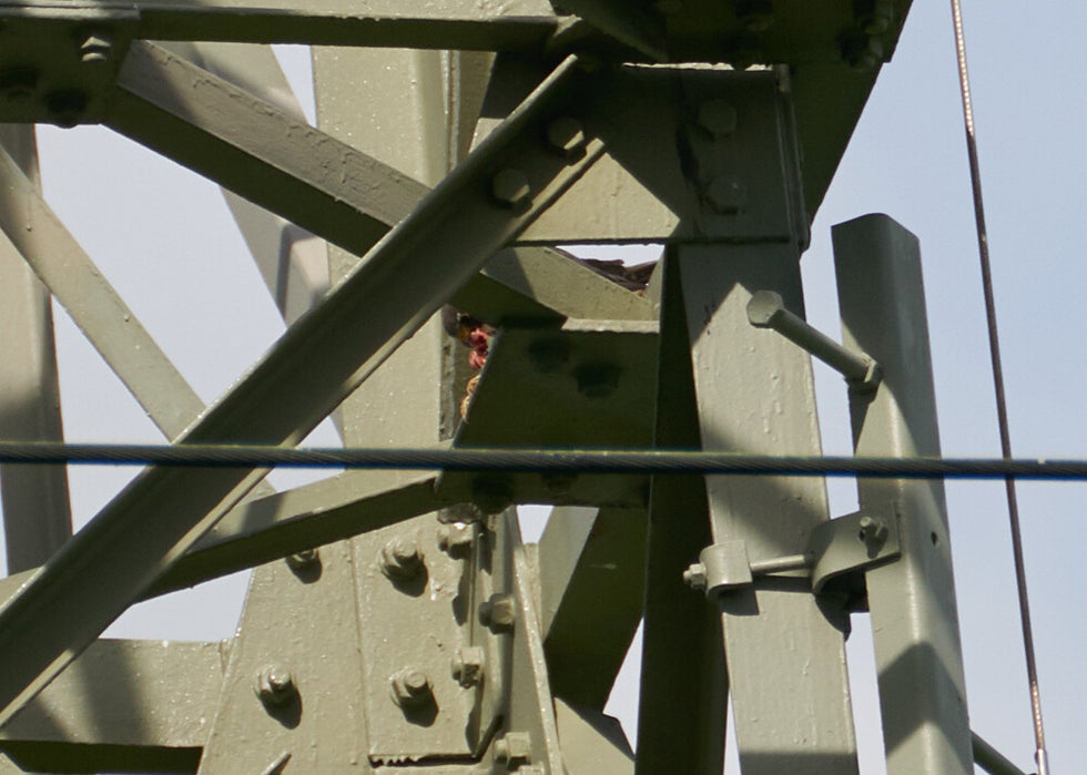 Ze vliegt naar de 375 meter verderop gelegen mast 18, en zelfs vanaf deze afstand zijn haar ringen nog te onderscheiden..: