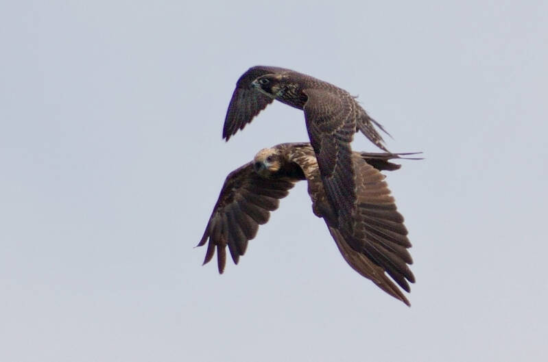 -De Kiekendief heeft met zijn linkerpoot de linkervleugeltop van de Slechtvalk vast.