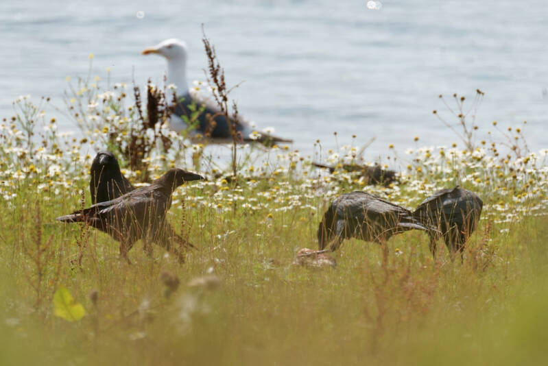 Kraai en Kleine Mantelmeeuw bij Amerikaanse Rivierkreeft :