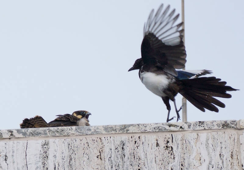 Als de oudervogel weg is verschijnt de plaatselijke Ekster......Ze zijn uit op kliekjes, maar durven zelfs de buit van jonge onervaren Valken te kapen!