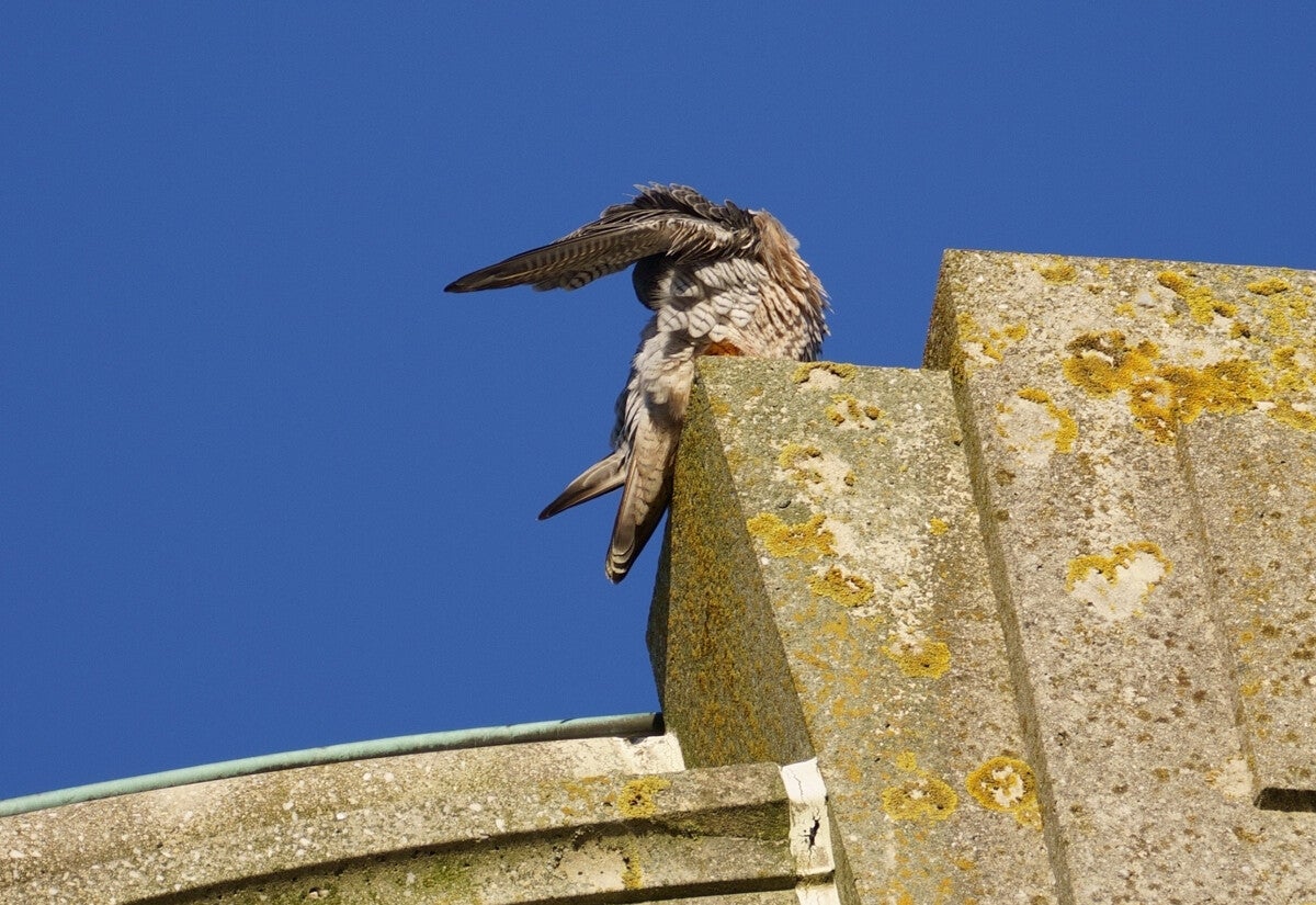 -Na een half uurtje afspeuren van hoge gebouwen tref ik hier een grote Valk. De Vogel vliegt helaas weg voordat ik ben afgestapt.