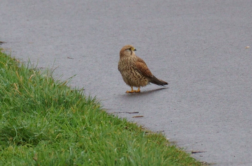 Op een fietspad moet ik stoppen voor een Torenvalk.