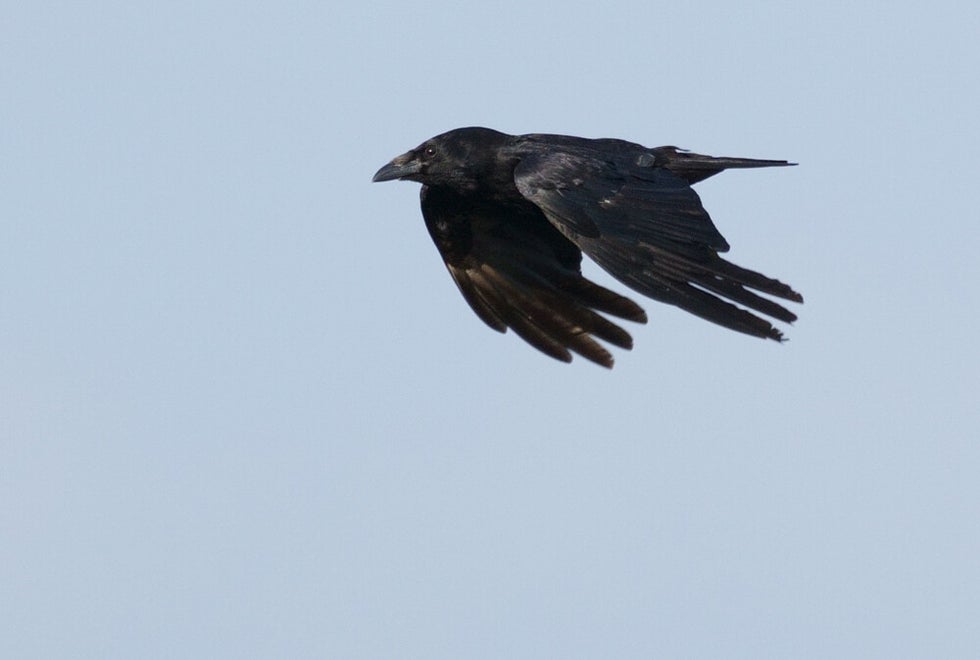 Het vrouwtje in de gebogen dreighouding als een buurkraai overvliegt :