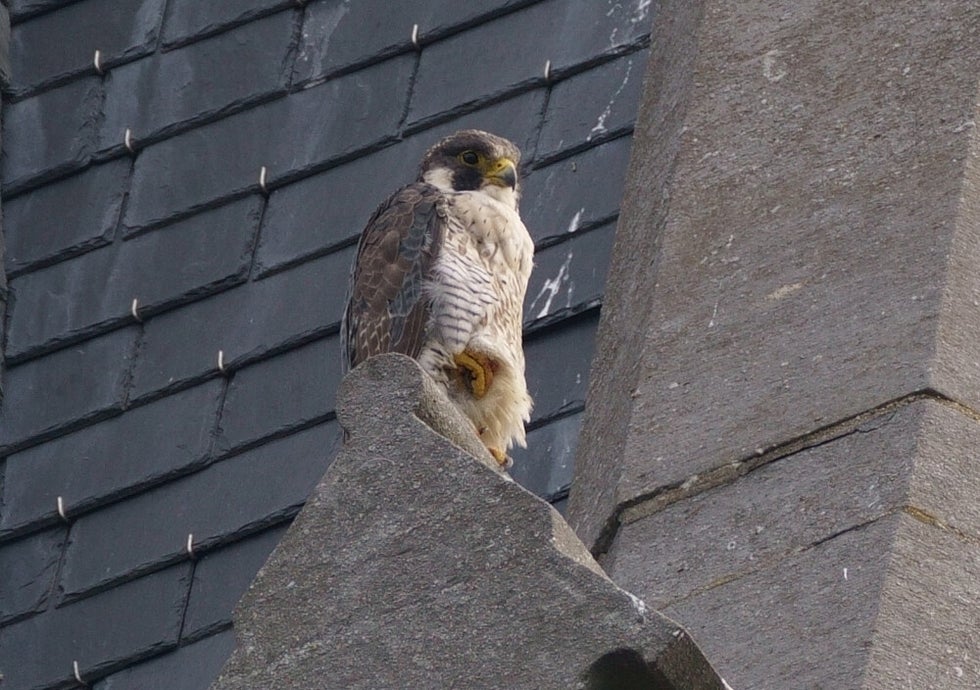 -Slechtvalkvrouw X8 zetelt rond 19.30 uur op een schaduwrijke stek op de Laurentius in Voorschoten