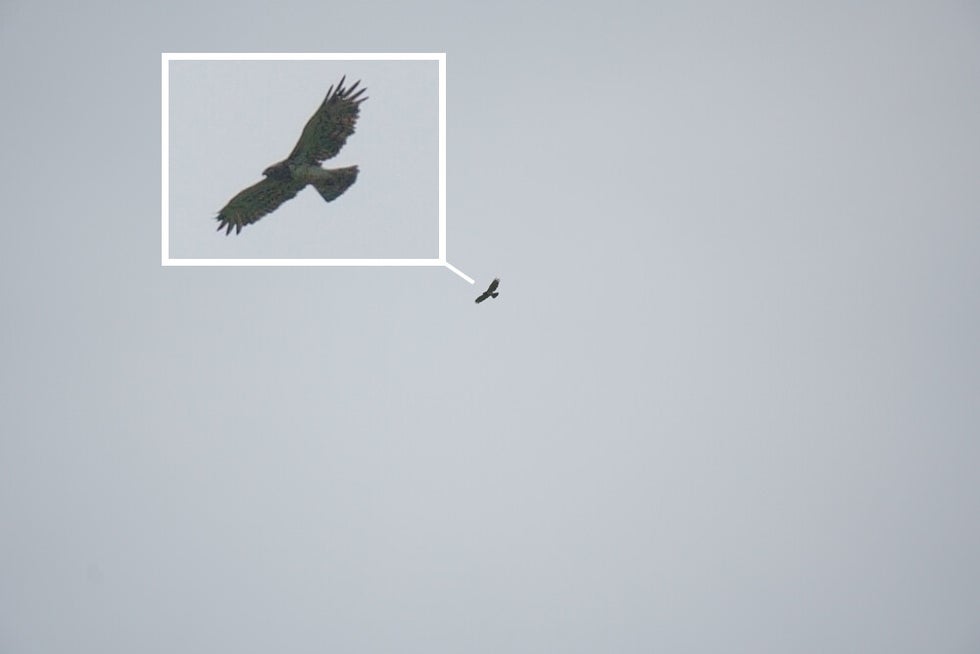 Na het onderonsje met de jonge Buizerd daalt de Wespendiefman in een lange glijvlucht af naar het nest :
