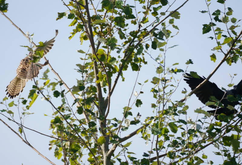 Een vaste Zwarte Kraai komt meerdere keren per dag een jeugdige Torenvalk plagen.
