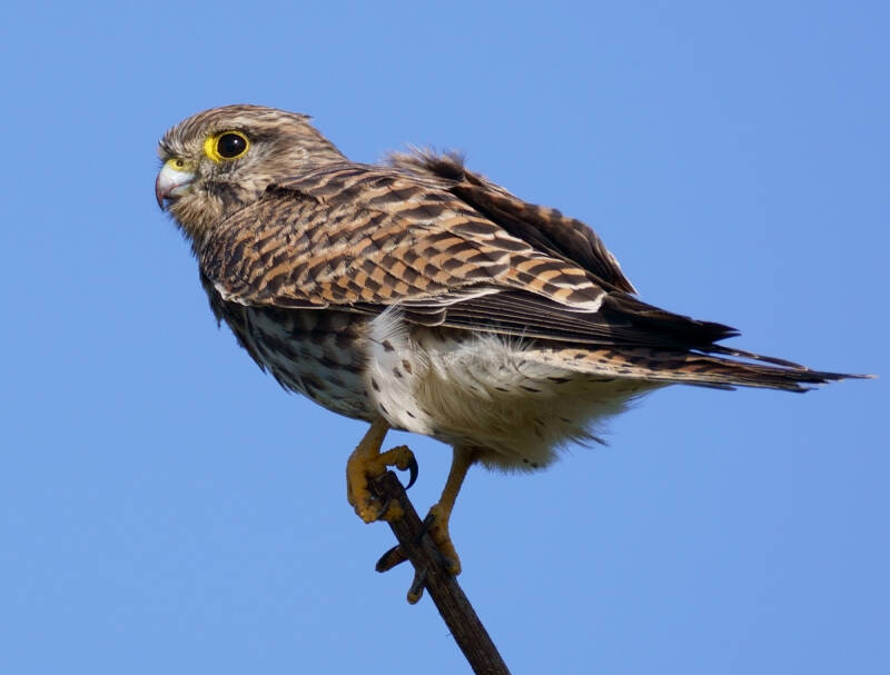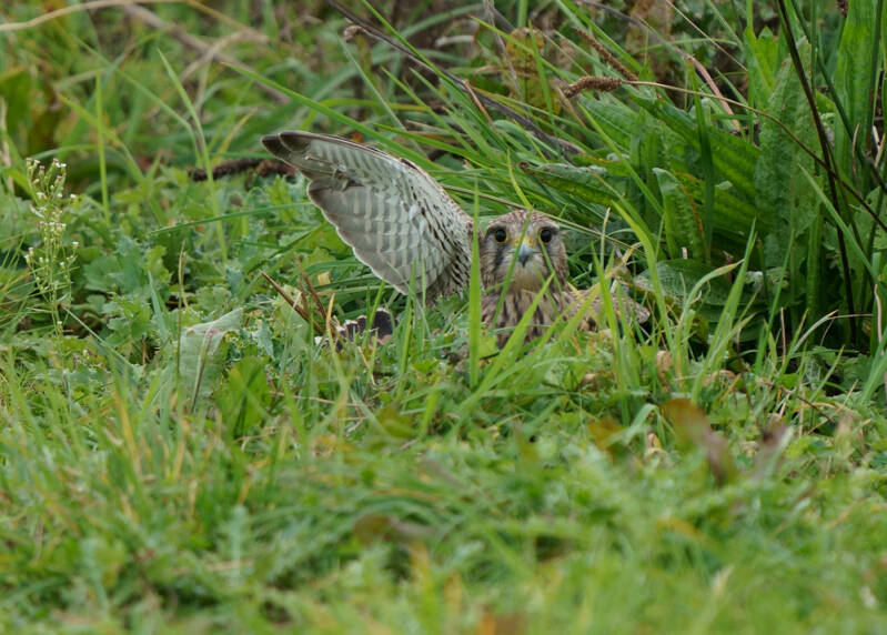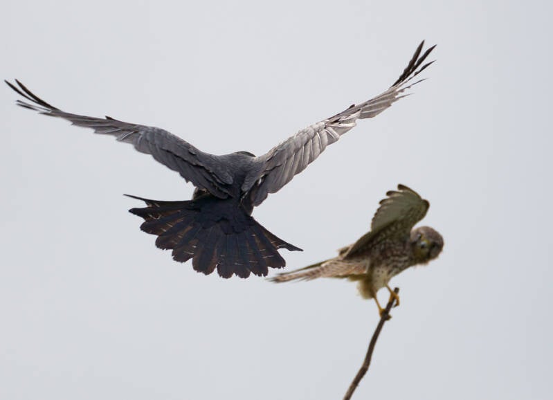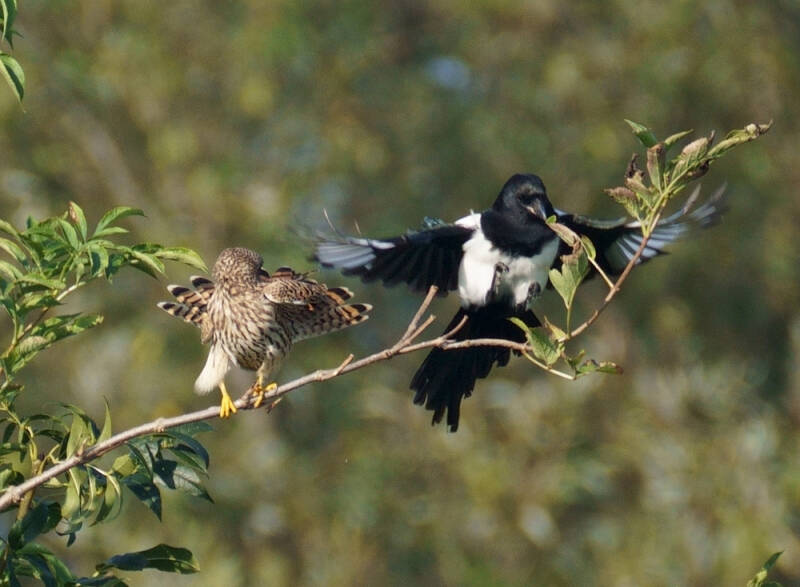 -Het plaatselijk volwassen Torenvalkmannetje laat hij met rust, de Zwartrokken weten precies in te schatten wie ze uit de tent kunnen lokken.